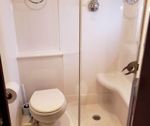 The 441’s expansive layout offers an inviting atmosphere, highlighted by Meridian’s signature two-tier window system that floods the salon, dinette, and galley with natural light. The open floor plan enhances visibility and flow between living spaces, making entertaining and extended cruising effortless. Below deck, a two-stateroom, two-head configuration ensures comfort for family and guests alike. The forward master suite features a queen island berth with innerspring pillowtop mattress, while the full-beam amidship guest stateroom offers a double berth, vanity, settee, and ample storage.