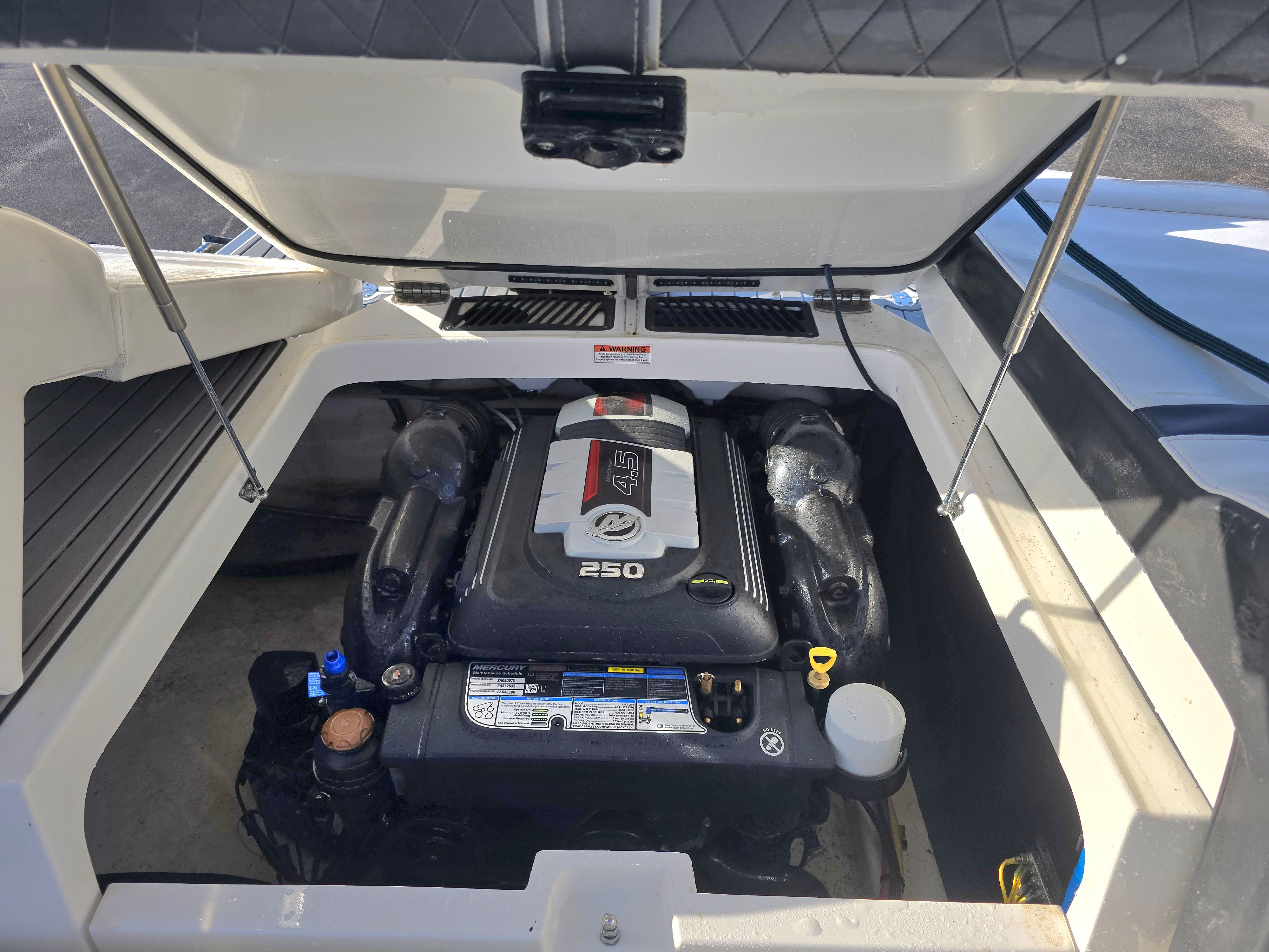 Under the hood, the Monterey 238SS is powered by a single engine delivering a robust 350 horsepower. With 380 engine hours, this boat has proven its reliability and performance on the water. The powerful engine ensures smooth acceleration, responsive handling, and the ability to reach impressive speeds, whether you are cruising, towing water toys, or simply enjoying a leisurely ride. The 238SS is engineered for efficiency and thrill, making every outing a memorable experience.