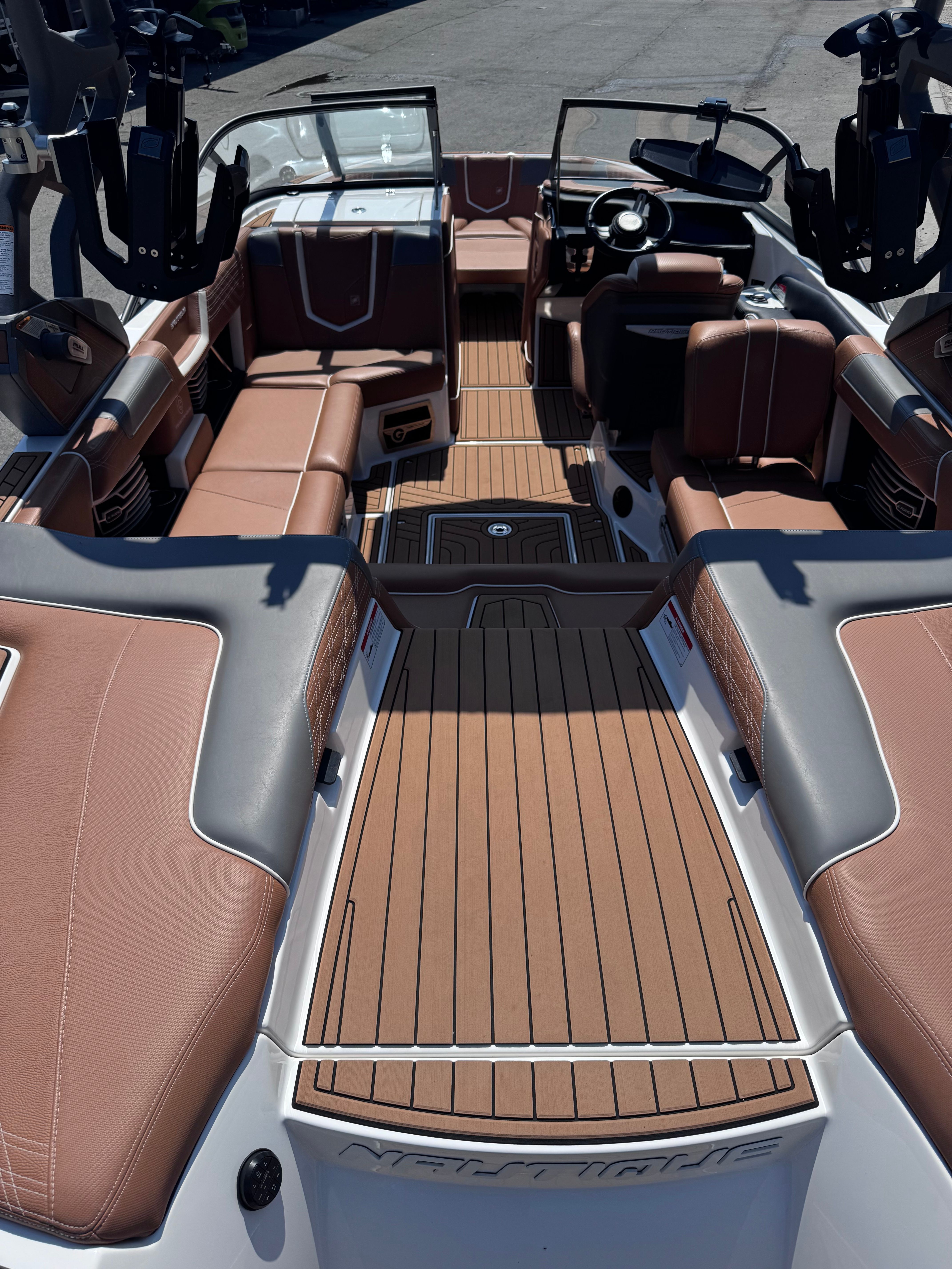 The Super Air Nautique G21 hull design works in concert with the Nautique Configurable Running Surface® (NCRS) to fine-tune the hull under any condition for every application along with 2,850 pounds of sub-floor internal ballast. Sharing the technology and ballast of the entire G-series line, the G21 leaves nothing to be desired in a twenty-one foot boat that maintains the ability to create the most progressive wake and wave in the industry. The Nautique Surf System is seamlessly integrated into the hull offering full wave customization with the ability to transfer to either side in seconds.