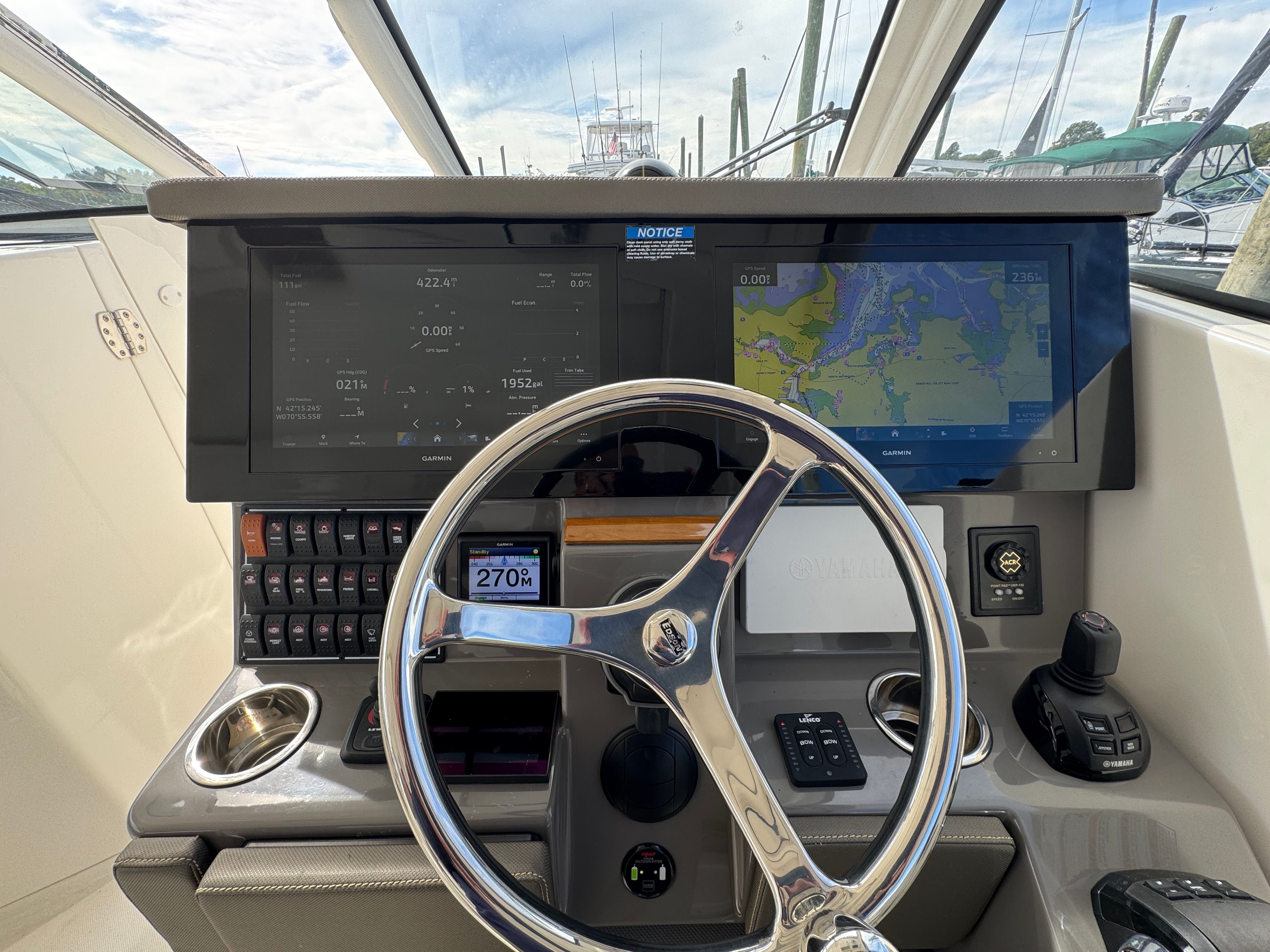 Power and precision define the performance of the Pursuit DC 365. Equipped with three powerful engines delivering a combined 900 horsepower, this dual console boat is engineered for exhilarating rides and smooth handling. The triple engine configuration not only provides impressive speed but also ensures optimal maneuverability and control, whether you are cruising along the coastline or navigating through choppy waters. With only 189 engine hours, these engines have plenty of life left, offering peace of mind and confidence for your next adventure.