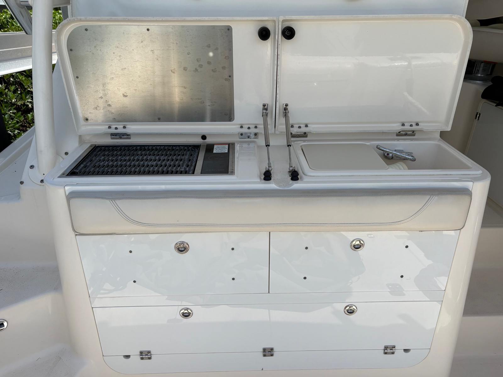 Powering the Pursuit OS 345 are two high-performance engines, delivering a combined 700 horsepower. With only 360 engine hours, these engines offer reliability and plenty of life for future adventures. The twin-engine setup ensures smooth acceleration, responsive handling, and the confidence to tackle a variety of water conditions. Whether you’re cruising along the coastline, heading to your favorite fishing spot, or embarking on a weekend getaway, the OS 345’s power and agility make every journey enjoyable.
