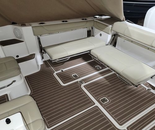 Beyond its luxurious features, the Pursuit 355 OS excels in practicality. The ample storage options allow you to keep your gear organized and easily accessible, whether you’re packing for a day trip or an extended voyage. The cockpit cover and drop curtain offer protection from sun and rain, helping to maintain the boat’s condition and ensuring comfort for all aboard. Docking and maneuvering are made easier thanks to the responsive twin engines and advanced controls, giving you confidence in tight spaces and busy marinas. The battery charger ensures your onboard systems remain operational, while the Sea Deck carpet provides a non-slip surface that’s both comfortable and safe. The inclusion of a cockpit grill and wet bar means you can enjoy gourmet meals and refreshing beverages without ever leaving the water, enhancing the overall boating experience.