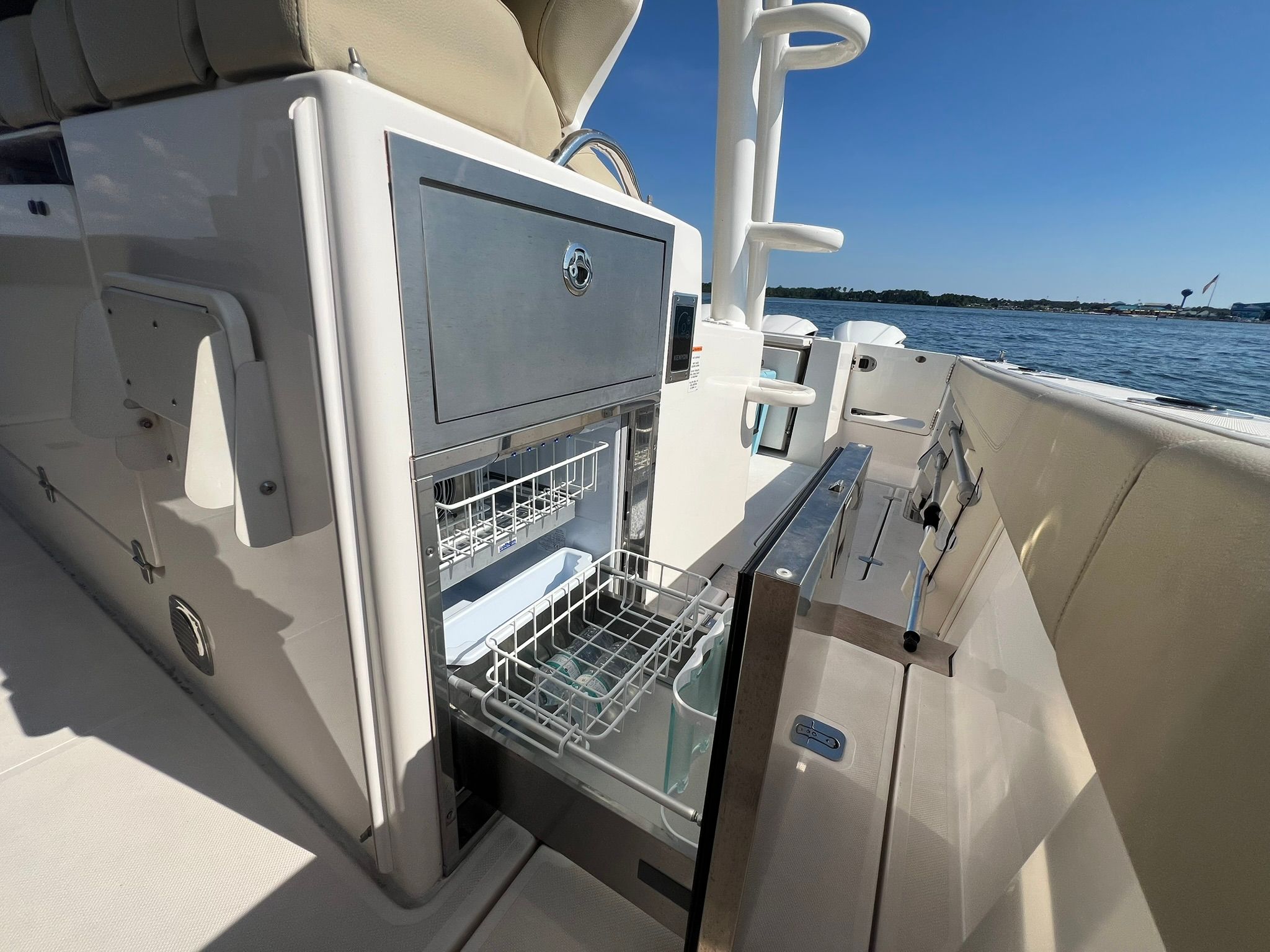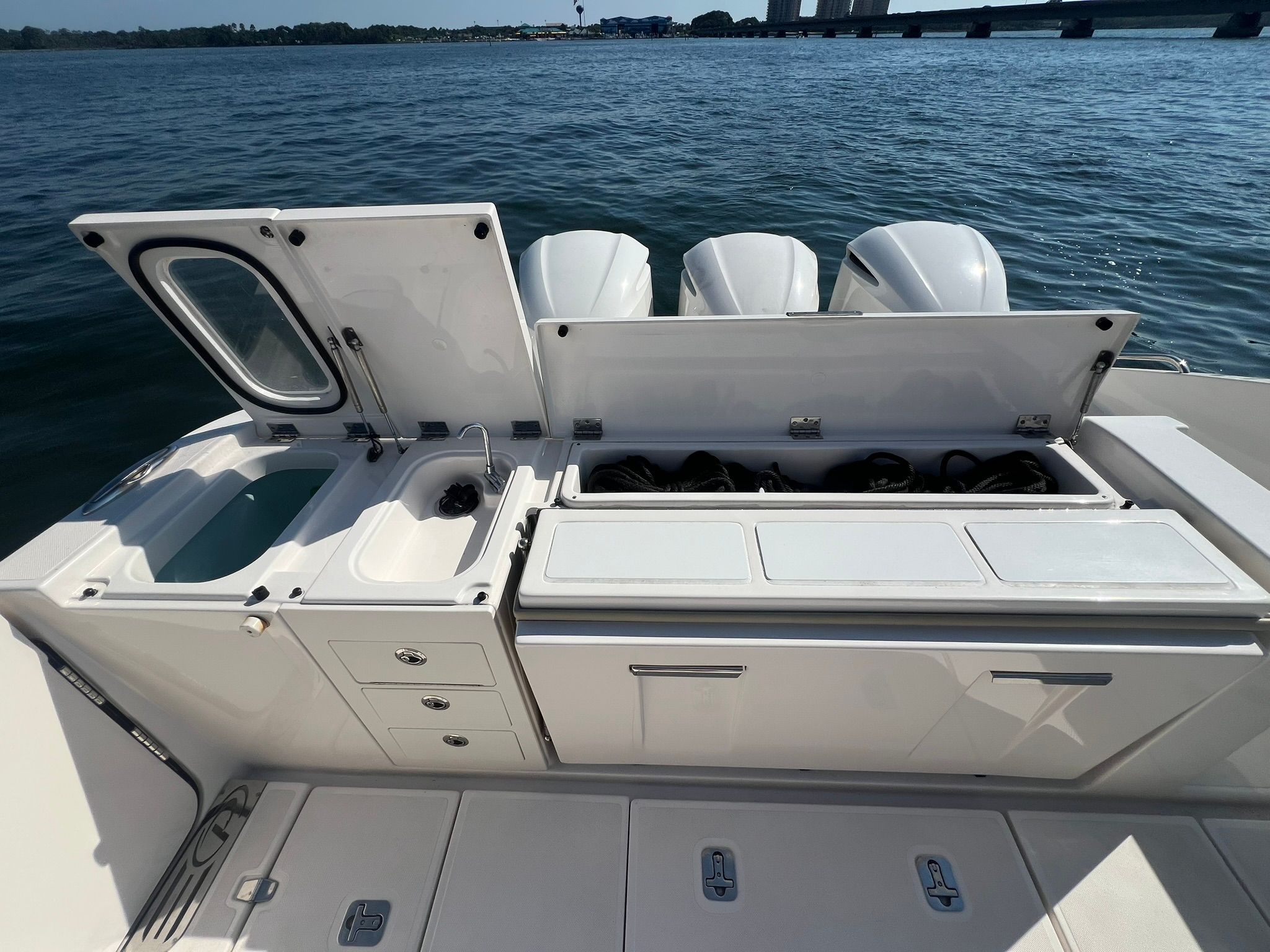 The Pursuit S 368 is designed with practicality in mind, making ownership both convenient and enjoyable. Its efficient triple-engine configuration offers a balance of power and fuel economy, allowing you to maximize your time on the water without frequent stops for refueling. The Center Console layout simplifies docking and maneuvering, making it easy to handle in a variety of settings. Ample storage space means you can bring along all the gear you need for fishing, water sports, or a day of relaxation.Maintenance is straightforward, thanks to Pursuit’s commitment to quality engineering and accessible systems. The boat’s durable construction ensures longevity, while its thoughtful design makes routine care and cleaning a breeze. Whether you’re storing the boat at a marina or trailering it to new destinations, the S 368’s manageable size and robust build make it a practical choice for a wide range of boating enthusiasts.