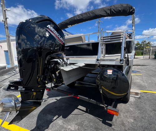 Shade & lighting: EasyLift™ Bimini top (10-foot) with LED courtesy lights, storage pockets, protective boot; LED navigation lighting; anchor/navigation light mounted on Bimini.
