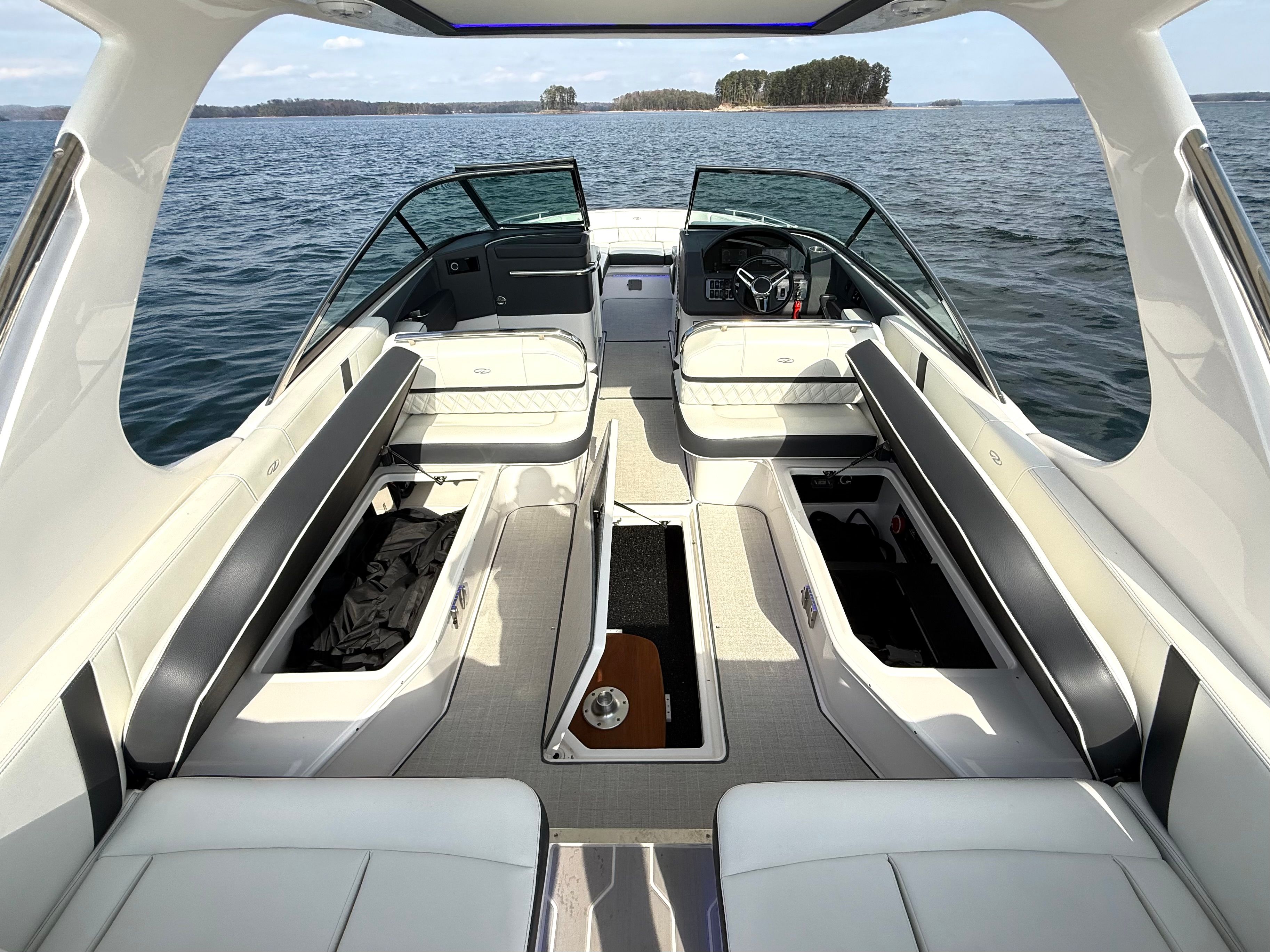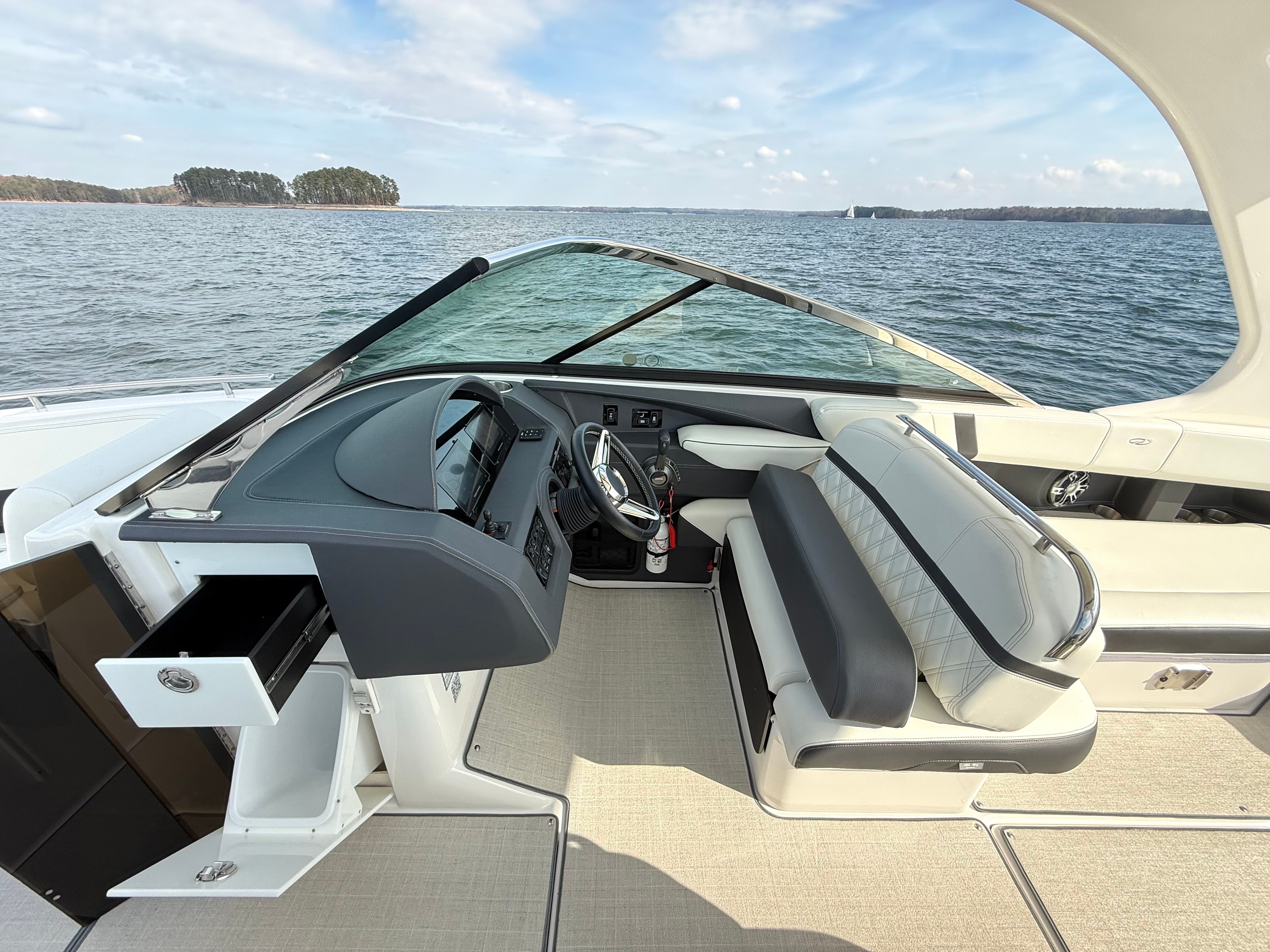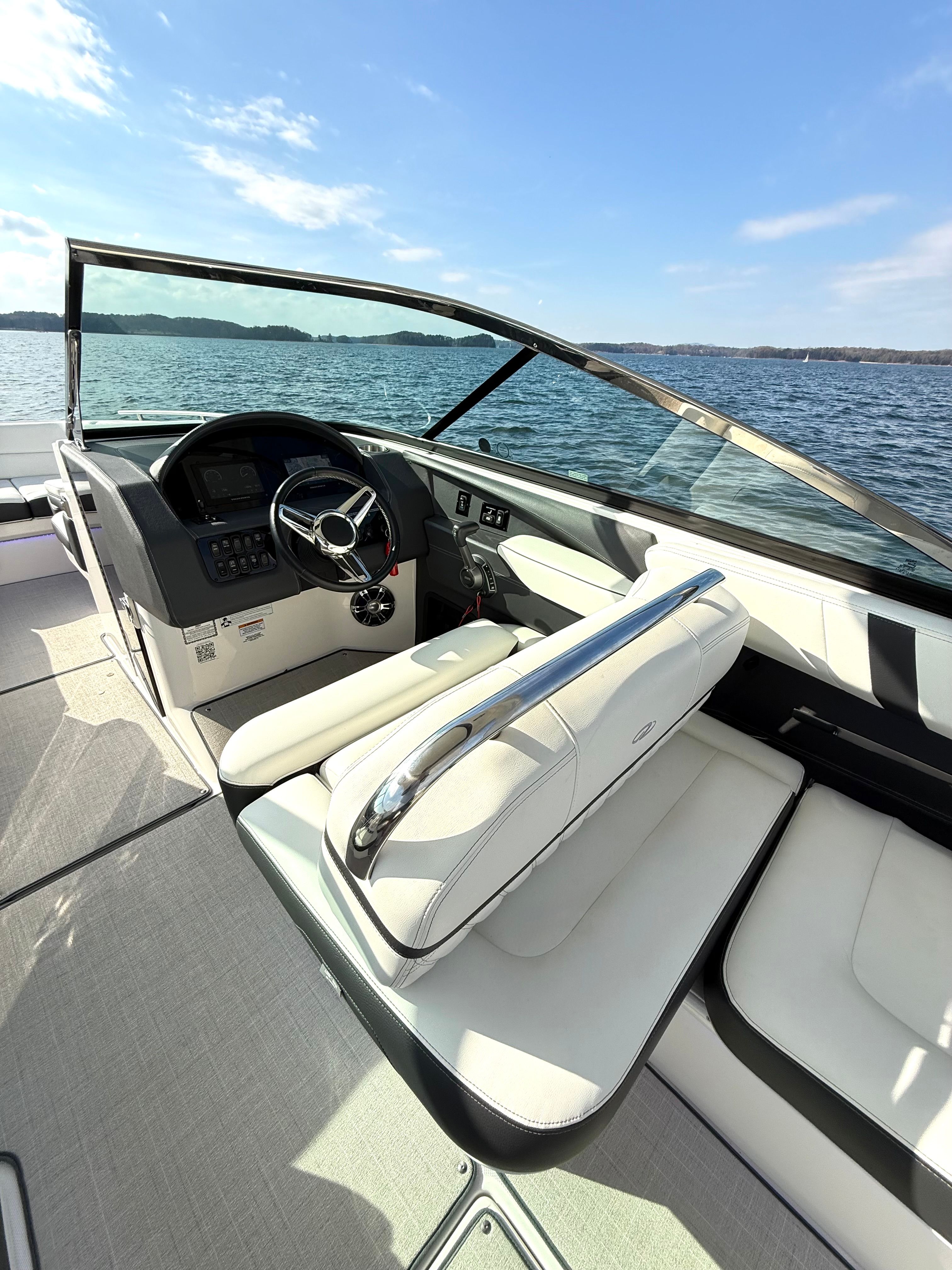 • Technology Package: 110V Battery Charger, Underwater Lights, Electric Helm Seat, Lighting Package, Docking Lights, High-Performance Stereo