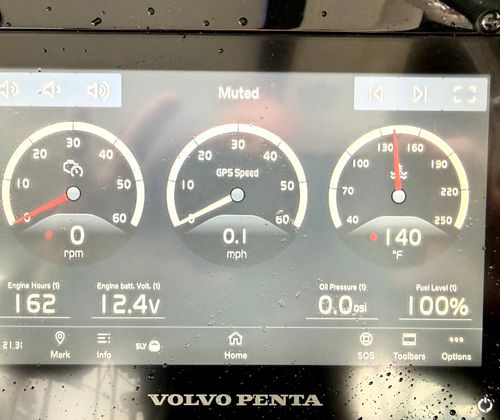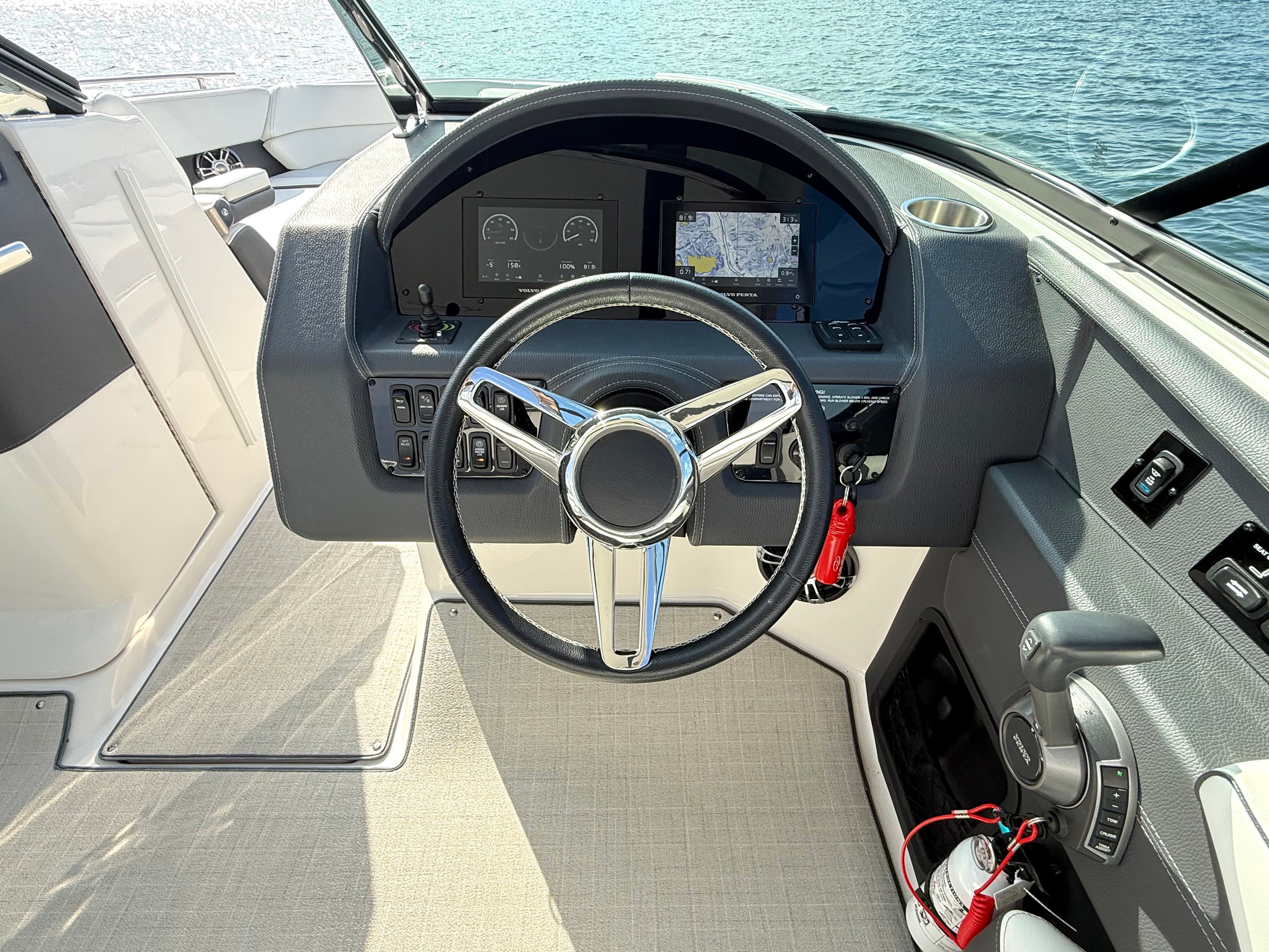 Step aboard and experience the many premium features, including dual 7” Volvo glass cockpit displays for full control and intuitive navigation, a hardtop for shade and style, and comfortable bow and cockpit seating with cockpit sea grass mats. Convenience and safety are built in, from the bow thruster and trim tab indicators to the electric sunshade and automatic fire extinguisher. Anchoring is effortless with the all-chain windlass and included anchor, while fender clips, stainless steel flagpole, and bow and cockpit covers add to the complete package.