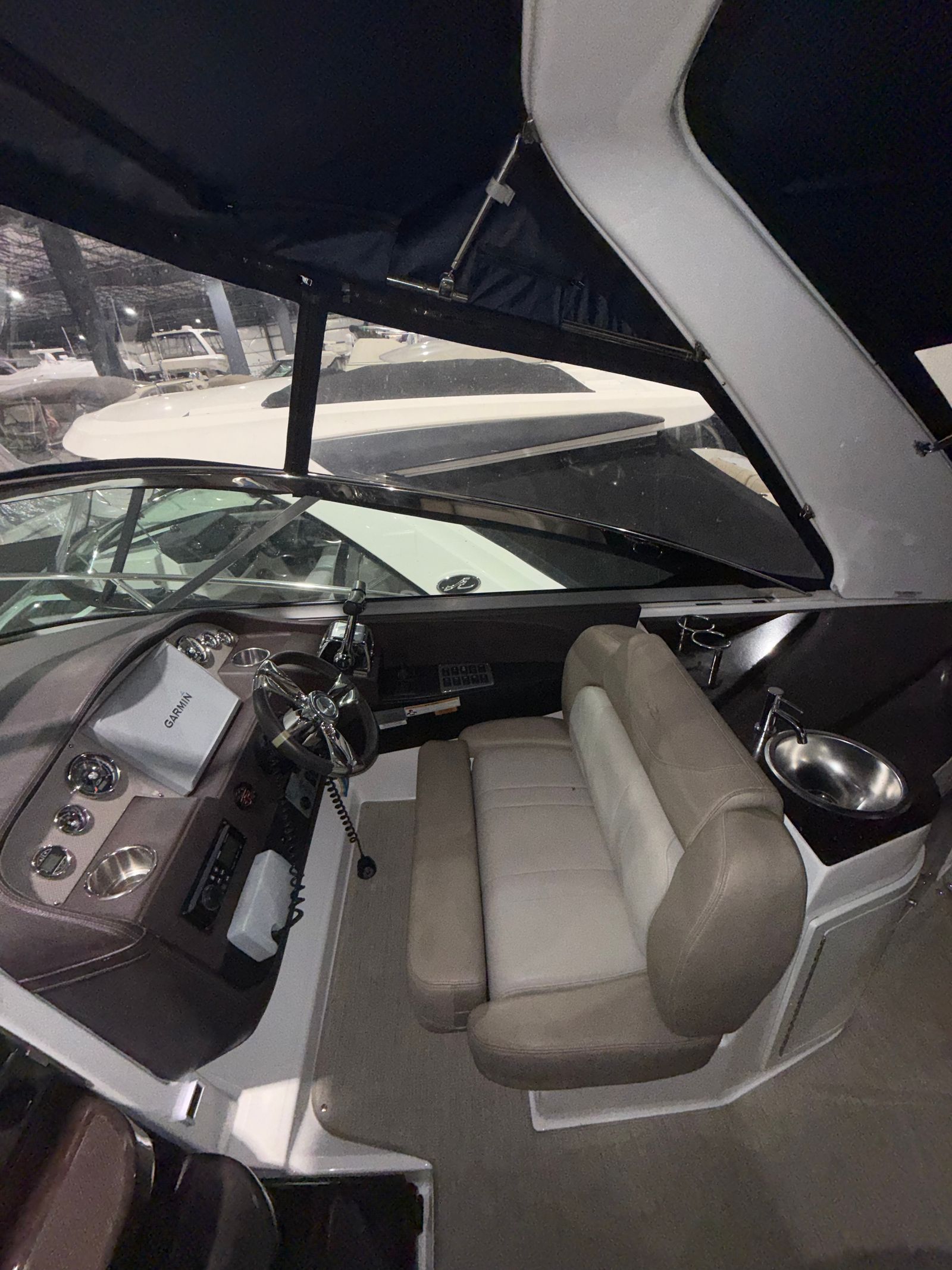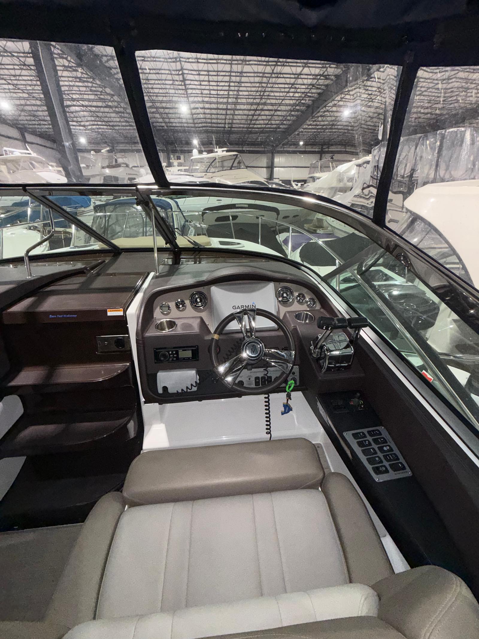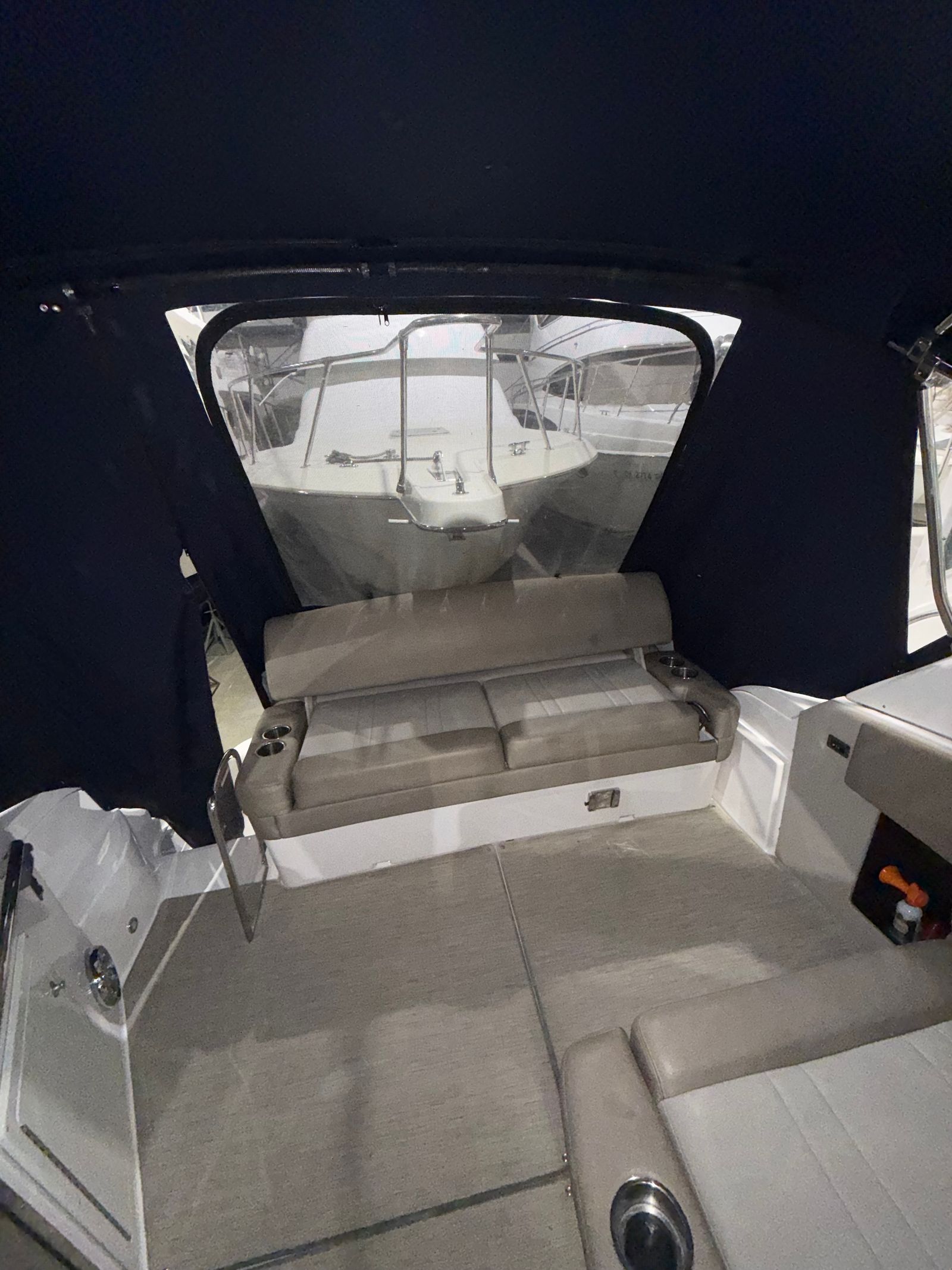 This cruiser boat for sale is equipped with a range of special features that enhance both comfort and convenience. The four onboard batteries ensure reliable power for all your electronics and amenities, while the battery charger keeps everything running smoothly during extended trips. The aft bench seat and aft cabin stateroom provide versatile seating and sleeping options, making it easy to accommodate family and friends for overnight stays or day cruises. Elegant cabinetry adds a touch of sophistication to the interior, offering practical storage solutions for your gear and personal items.The camper enclosure, featuring navy canvas that is only three years old, offers protection from the elements and extends your boating season. The cockpit carpet adds a layer of comfort underfoot, while the ample cockpit storage keeps your space organized and clutter-free. These features combine to create a welcoming environment that’s perfect for entertaining, relaxing, or simply enjoying the beauty of the water.