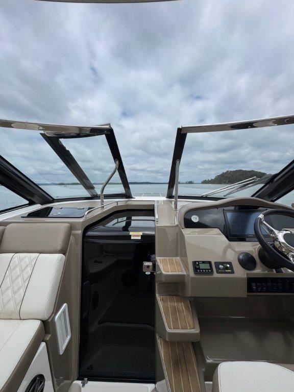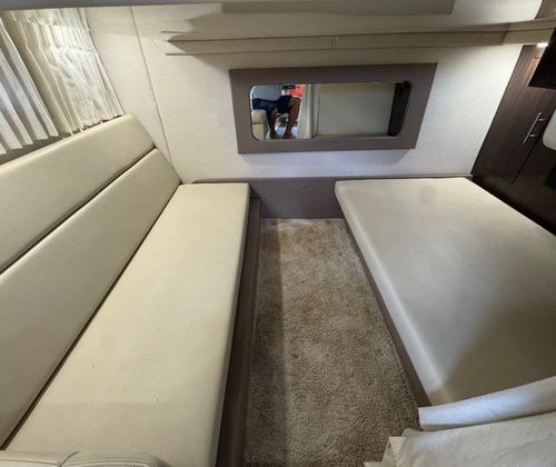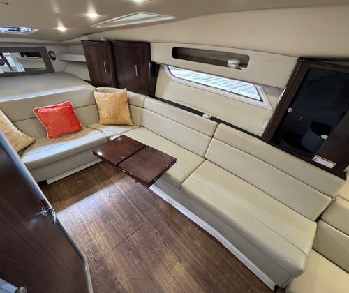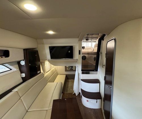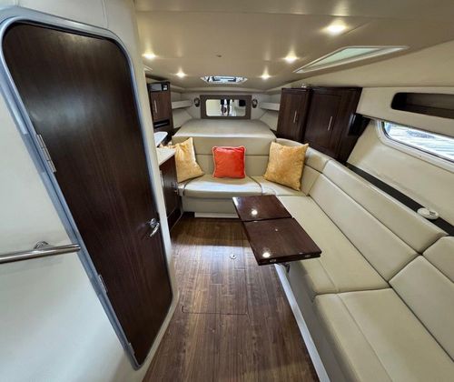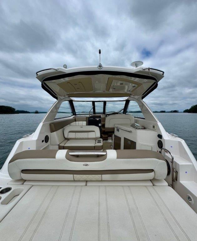 The hard enclosure and retractable hardtop have made the 35 Sport Coupe the #1 selling sport cruiser in its class. This design allows year-round boating in comfort, regardless of temperature. The cockpit is arranged for entertaining without leaving the party. On the starboard side, you’ll find a full wet bar with freshwater sink, smokeless grill, refrigerator, and ice maker, all within easy reach.