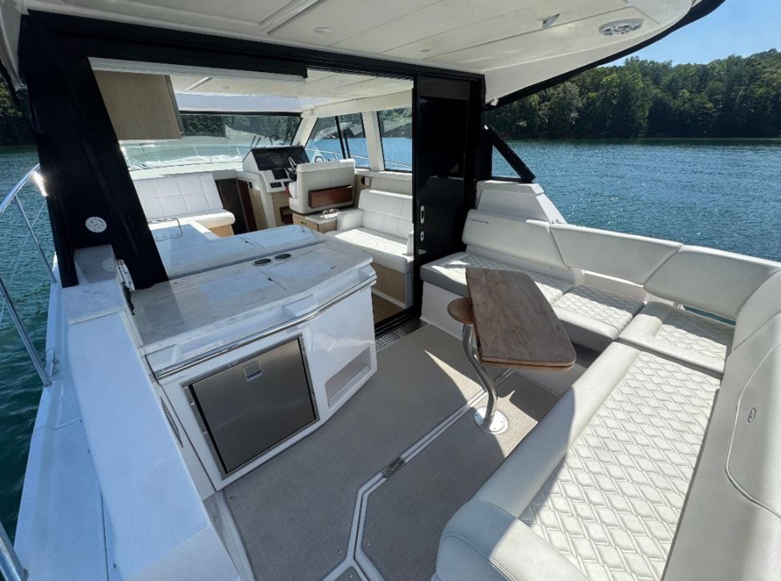 Professionally serviced by Singleton Marine, this 38 Grande Coupe is turn-key and loaded with premium features for both day cruising and extended stays aboard. The enclosed cockpit with Isinglass enclosure and electric sunroof provides year-round comfort, while the interior offers two private staterooms and a separate shower for a true home-away-from-home experience.