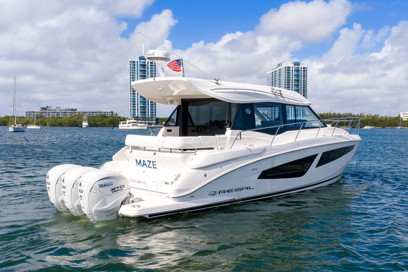 This 2024 Regal 42 XO is easily the most well equipped on the market. It was custom ordered from Regal factory and came completely loaded and then owner spared no expense with add-ons. It has DockMate Remote Docking, Reverso Auto Flush, Seakeeper 3, Humphrey Auto Trim Tabs, Starlink, and much more. This 42 XO is a highly equipped luxury outboard express cruiser powered by triple Yamaha 450s, delivering outstanding performance, range, and maneuverability. Designed for both entertaining and extended cruising, the 42 XO offers Regal’s spacious cockpit layout, enclosed salon with panoramic windows, and comfortable overnight accommodations.