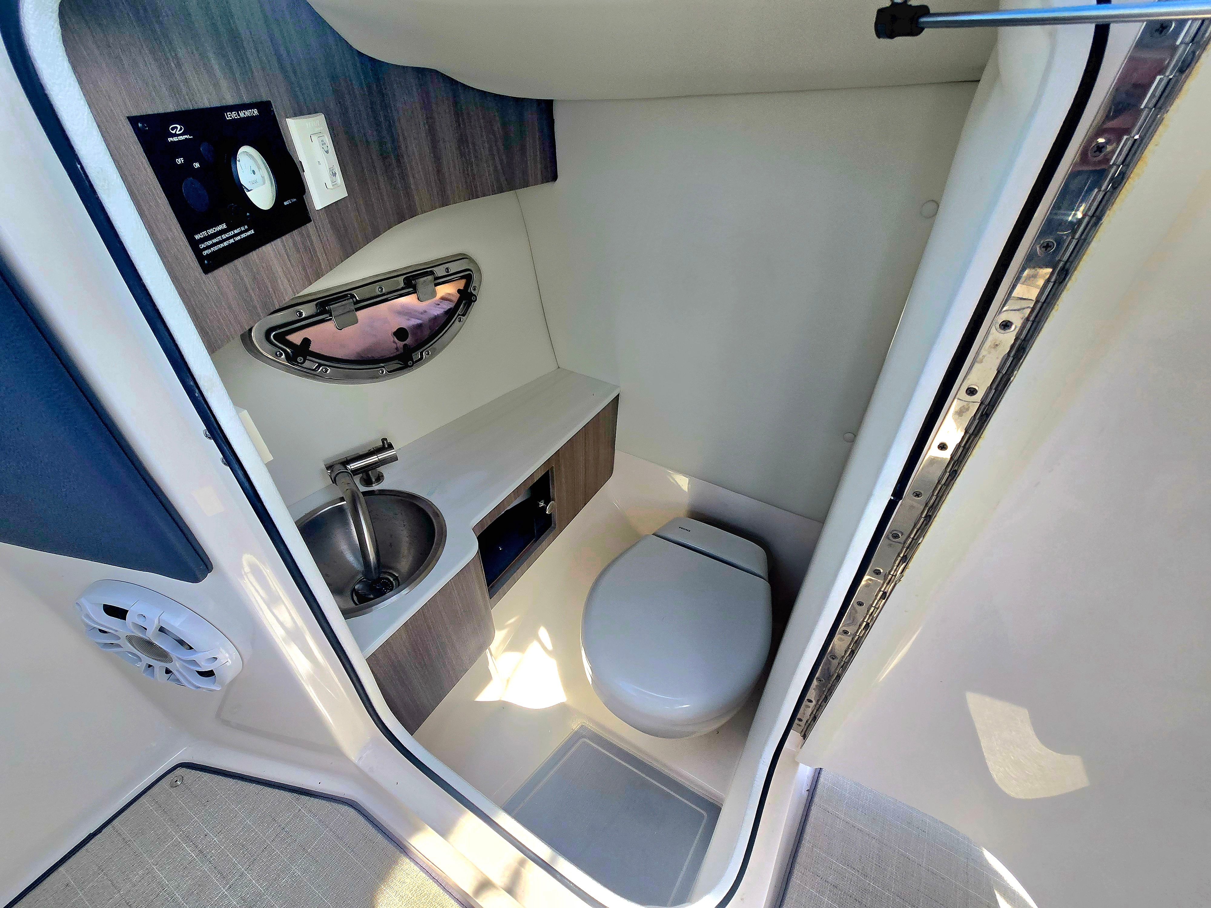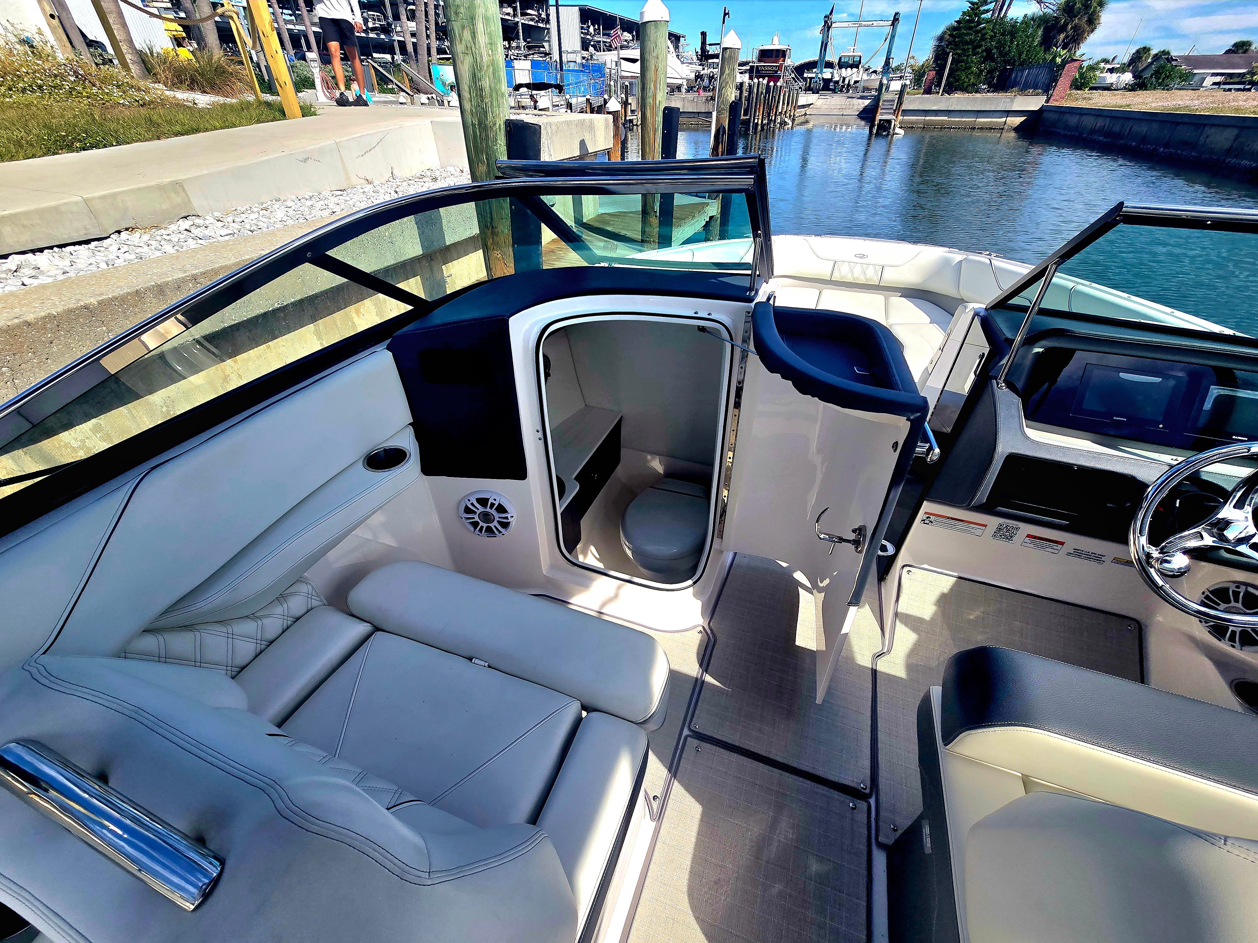 The Regal LX6 is packed with features that enhance comfort, convenience, and enjoyment. Its spacious bow seating area invites guests to relax and soak up the sun, while the open cockpit layout ensures everyone has room to move and socialize. The ergonomic helm station offers intuitive controls and excellent visibility, putting the captain in command with ease. High-quality materials and attention to detail are evident throughout, from the plush upholstery to the stylish accents that define the LX6’s interior.With a length of 26.25 feet, the LX6 provides ample storage for all your gear, ensuring a clutter-free environment. The thoughtful design maximizes usable space, making it easy to stow water toys, coolers, and other essentials. The boat’s layout encourages conversation and connection, with plenty of seating options for guests to gather and enjoy the ride.