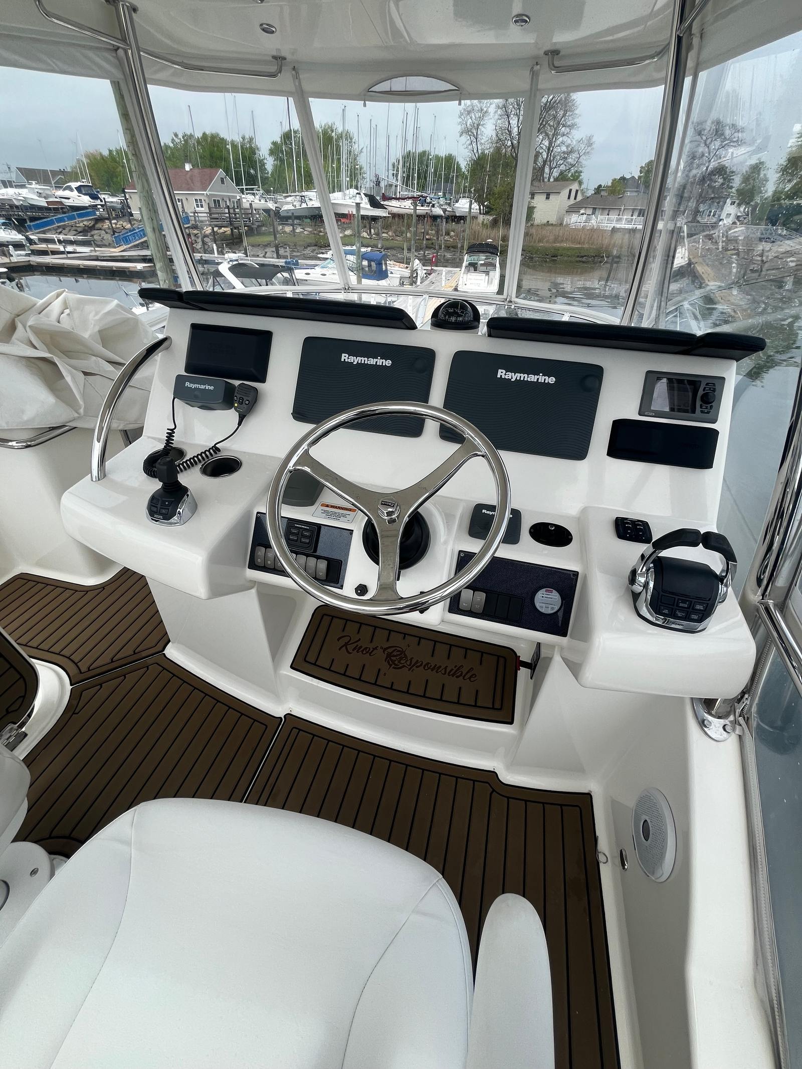 Powering the Riviera 43 Flybridge are two robust engines, delivering a combined 870 horsepower. This impressive power package ensures smooth acceleration, responsive handling, and the ability to cruise comfortably at a variety of speeds. Whether you are navigating coastal waters, exploring offshore destinations, or simply enjoying a leisurely cruise, the performance of this flybridge boat is sure to impress. The twin-engine configuration not only enhances maneuverability but also provides peace of mind for longer journeys, making this Riviera boat for sale a reliable choice for both seasoned captains and newcomers alike.