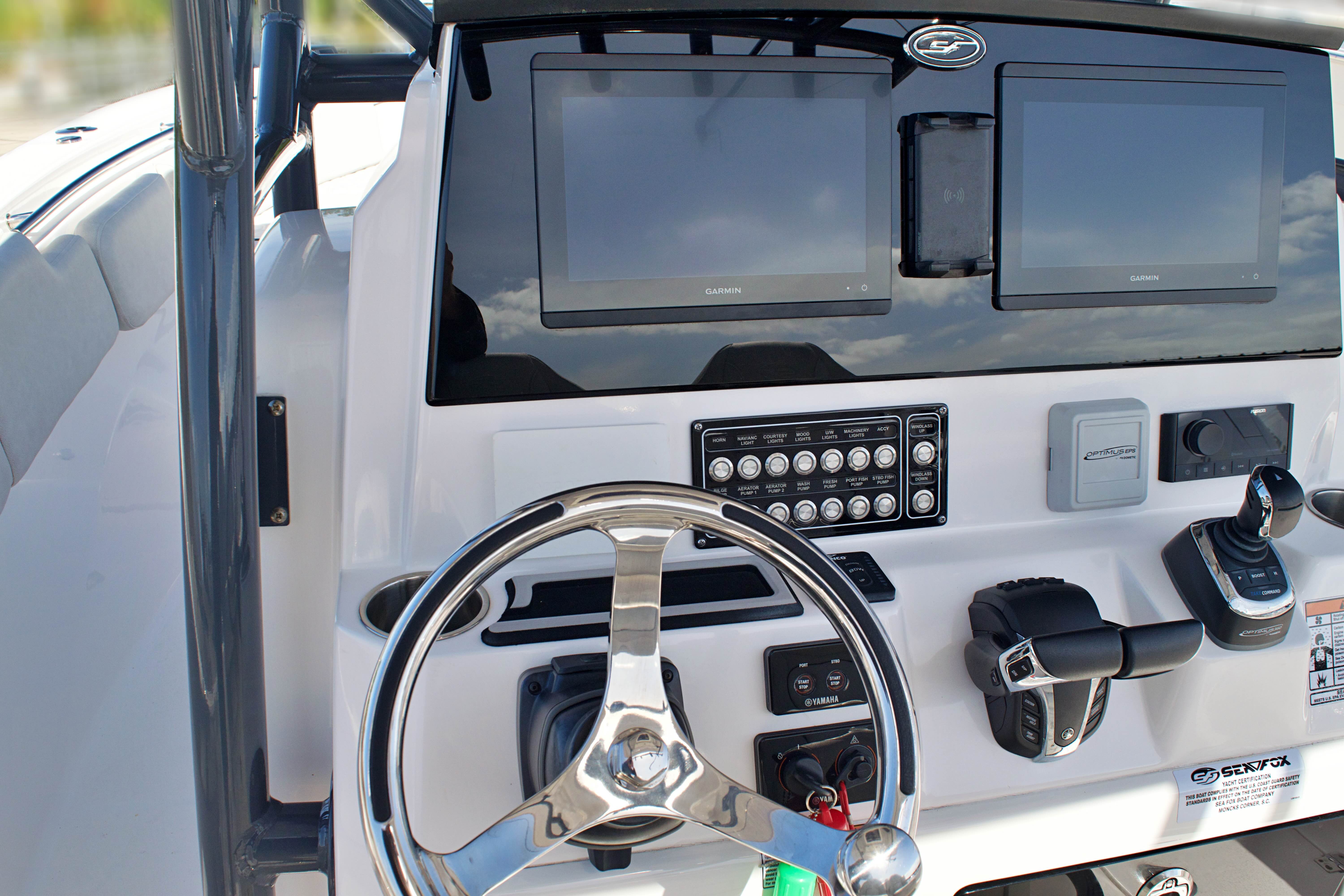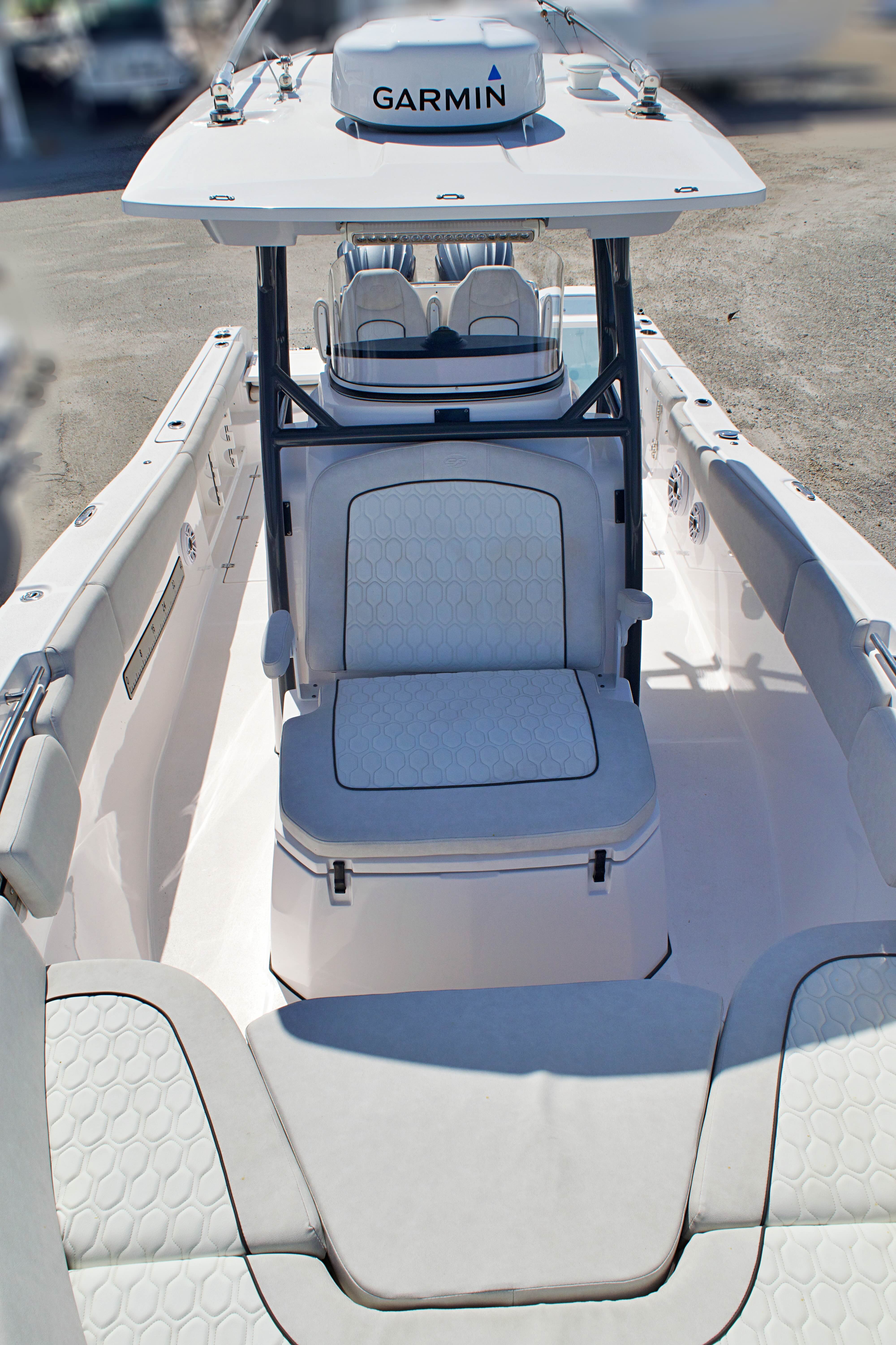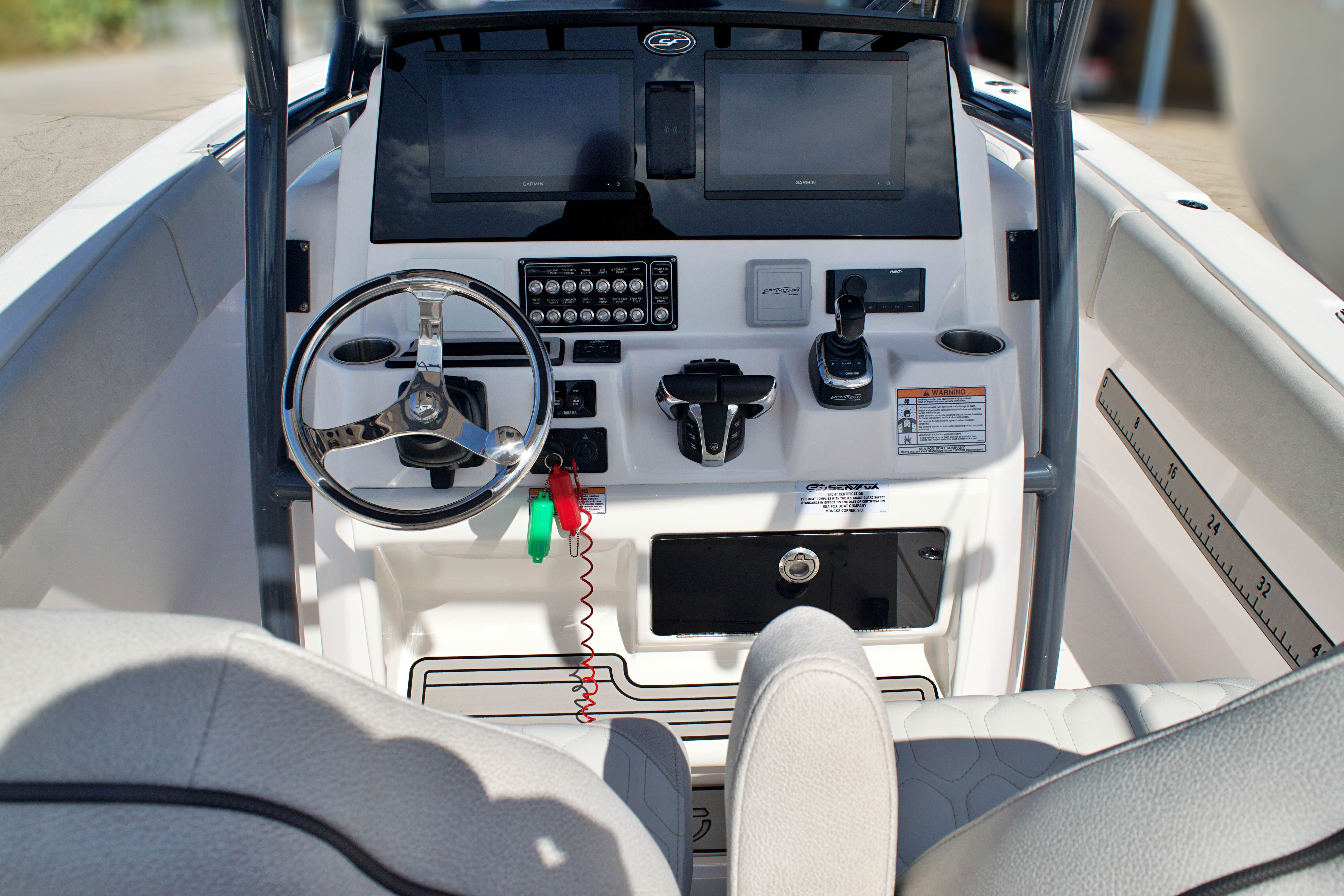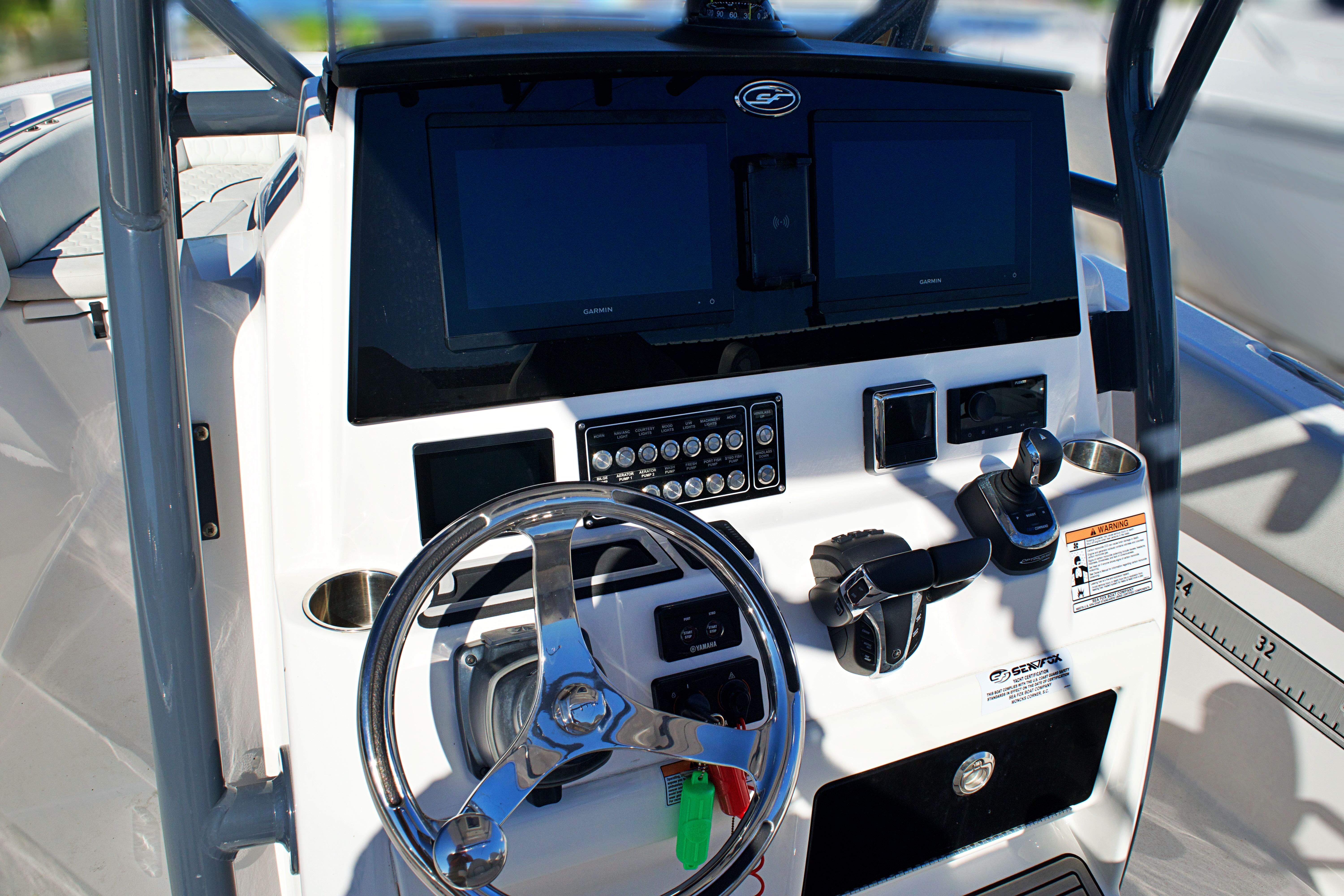 Features and Specifications: The Sea Fox 288 Commander is packed with features designed to enhance your time on the water. Its spacious center console layout provides ample room for movement, making it easy to transition from fishing to entertaining. The helm is ergonomically designed for comfort and control, with intuitive instrumentation and easy access to all controls. The 28-foot length offers generous deck space, perfect for casting lines, lounging in the sun, or hosting friends and family.Special features on this model include a robust twin-engine configuration, which not only boosts performance but also adds a layer of safety for offshore excursions. The boat’s modern design incorporates high-quality materials and attention to detail, ensuring durability and a premium feel throughout. Storage compartments are thoughtfully placed to keep gear organized and out of the way, while the center console provides protection from the elements and a commanding view of your surroundings.