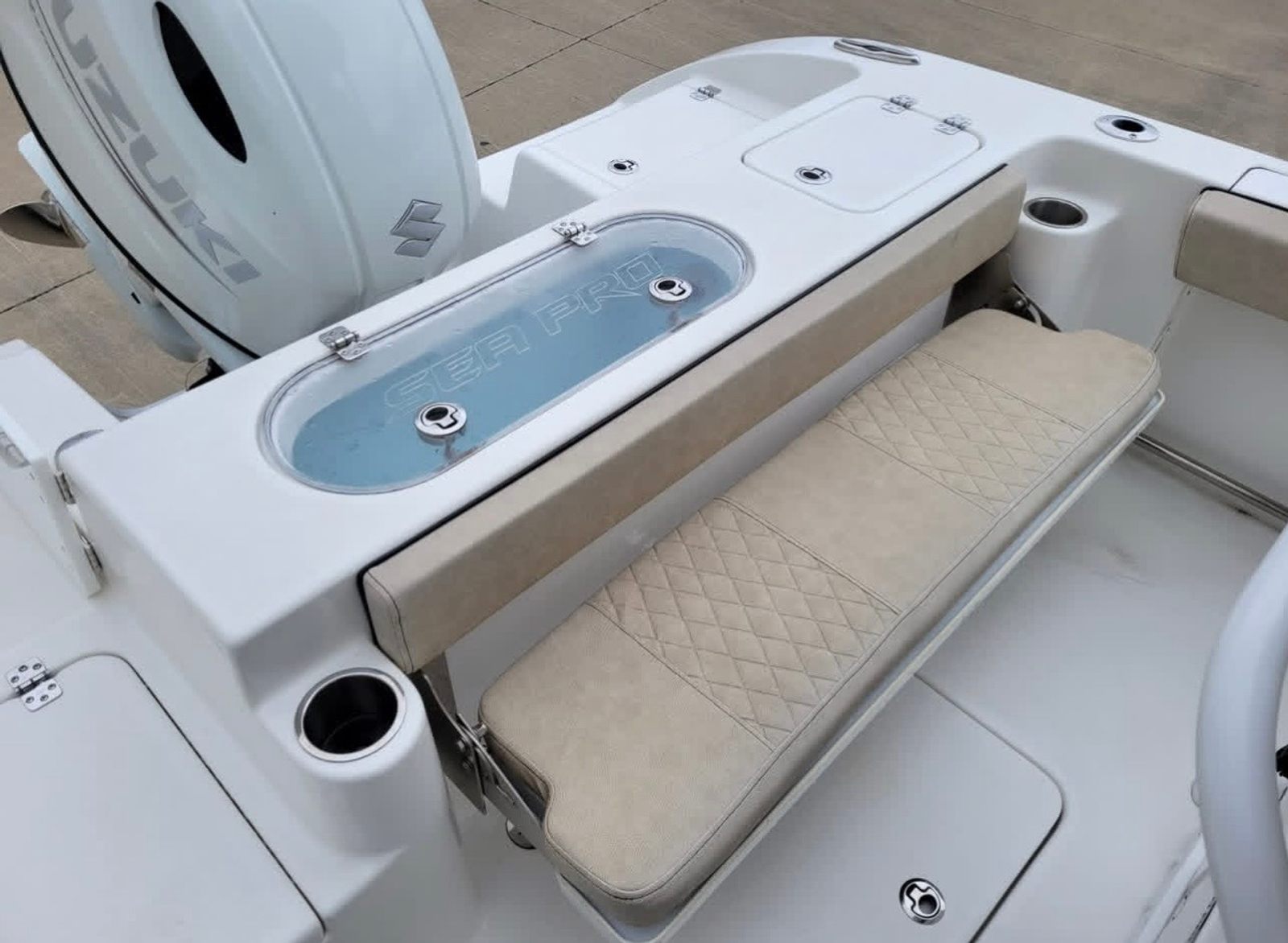 This Sea Pro boat for sale comes equipped with a range of special features designed to enhance your time on the water. The integrated battery charger ensures your boat is always ready to go, while the bow seating offers a comfortable and scenic spot for passengers to relax. Cockpit coaming bolsters add an extra layer of comfort and safety, making long days on the water more enjoyable. Ample cockpit storage keeps your gear organized and out of the way, so you can focus on fun and relaxation.Navigational tools like the compass and Simrad GPS/Chart Plotter with fish-finding capabilities make it easy to explore new waters and locate the best fishing spots. The depth sounder provides real-time information about water conditions, adding peace of mind as you cruise. Gunwale rod holders are perfect for anglers, keeping rods secure and accessible. Helm stereo controls allow you to set the perfect soundtrack for your day, ensuring every outing is memorable.