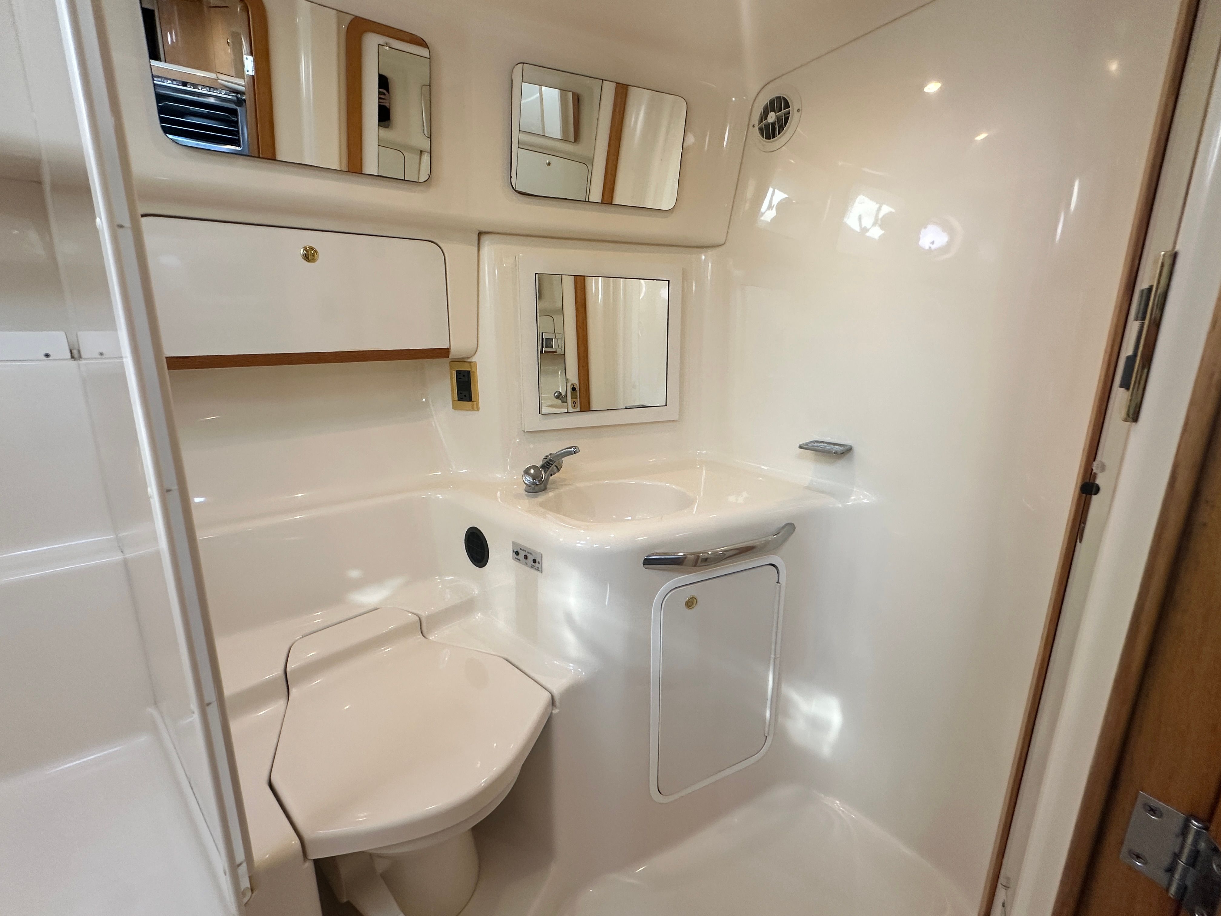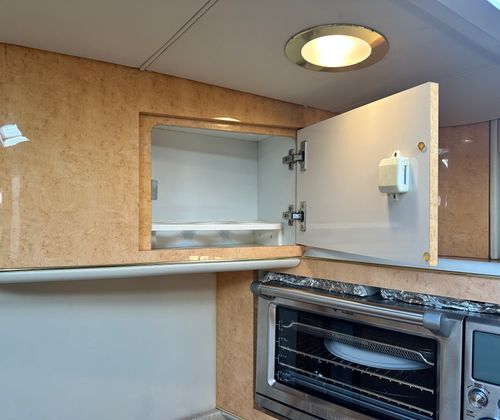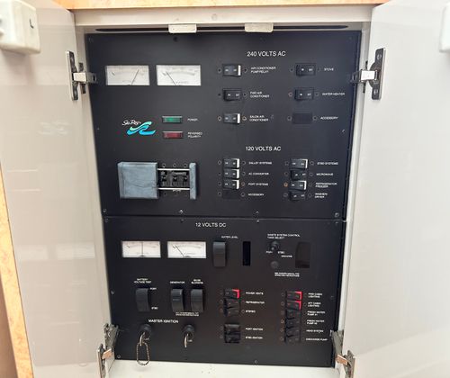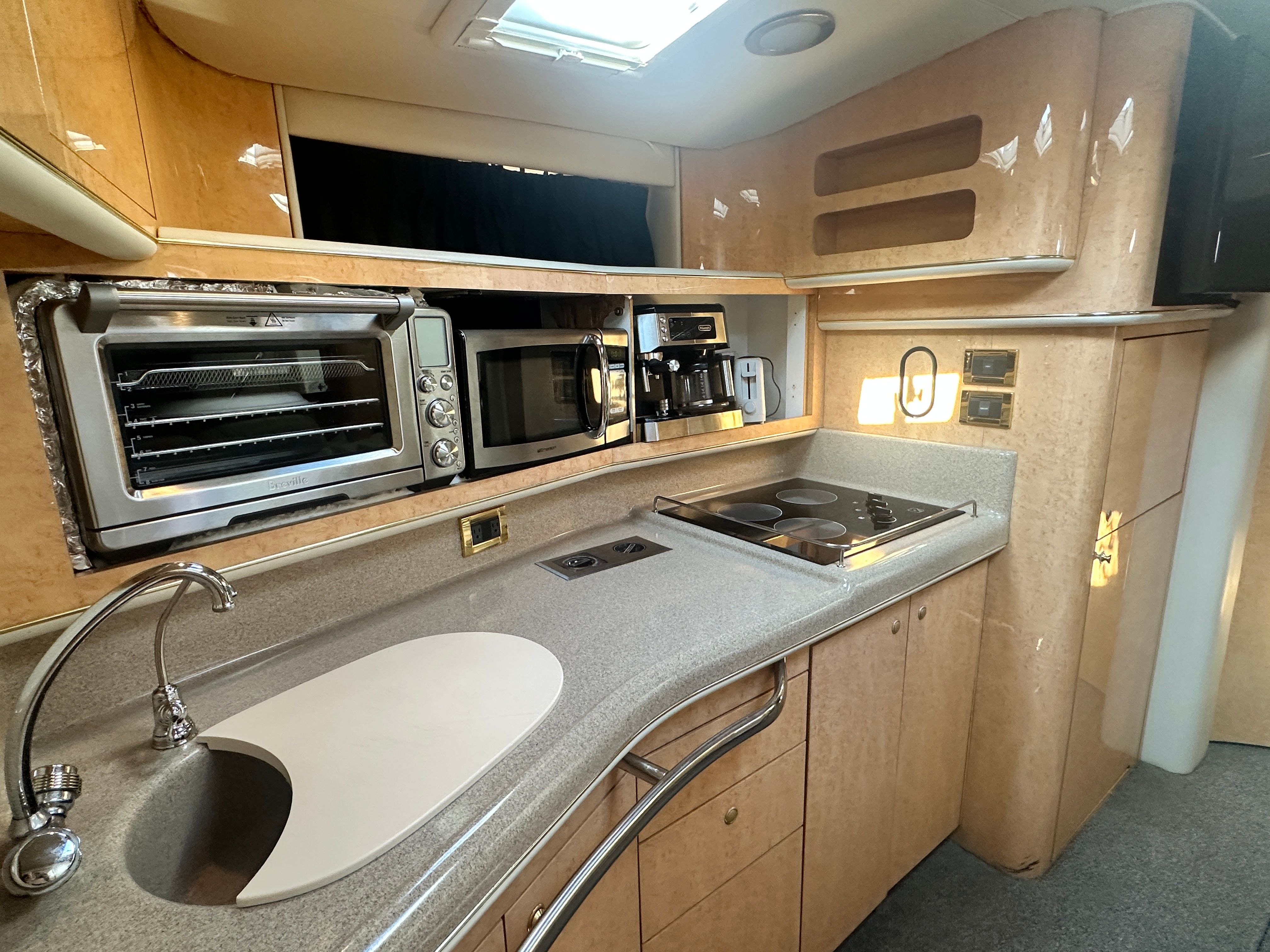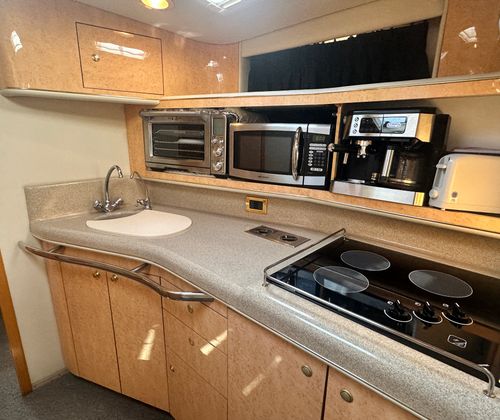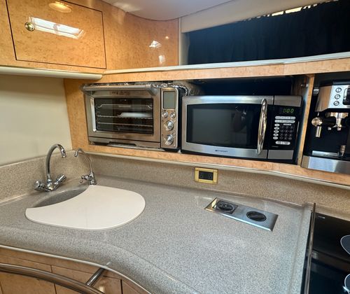 Under the hood, the Sundancer 450 is powered by twin engines, delivering a combined 840 horsepower. With only 428 engine hours, these motors promise robust performance and longevity, ensuring many more seasons of smooth cruising ahead. The dual-engine setup provides enhanced maneuverability and stability, making docking and navigating tight spaces a breeze. Whether you’re cruising along the coastline or heading out for a weekend adventure, the Sundancer 450’s powerful engines offer the speed and reliability you need for a truly exhilarating experience on the water.