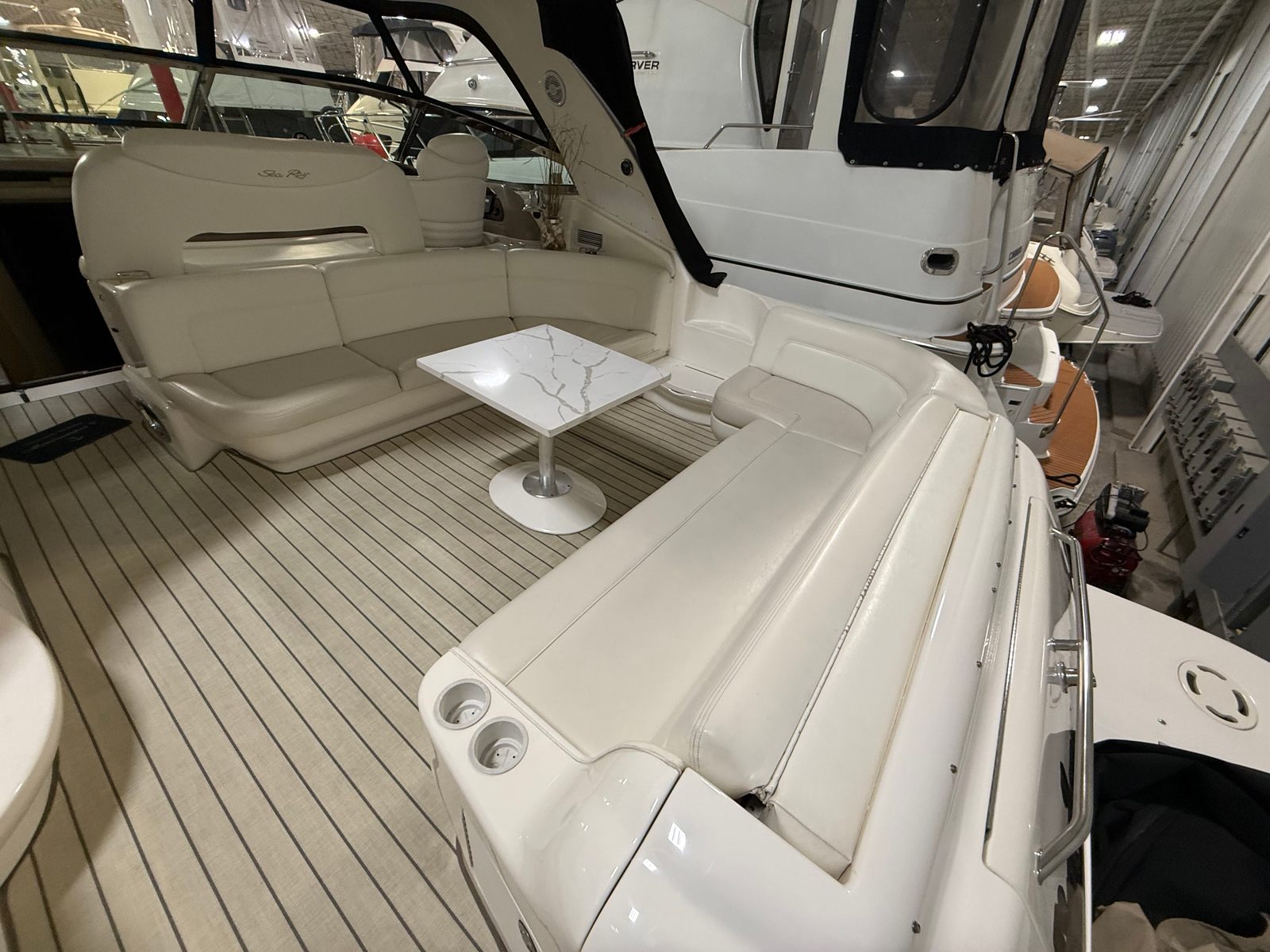 Under the hood, the Sea Ray 460 Sundancer is powered by twin engines, delivering a combined 900 horsepower. With only 825 engine hours, these engines promise reliable performance and plenty of life left for future adventures. The robust powertrain ensures smooth acceleration, responsive handling, and the ability to cruise effortlessly across the water. Whether you are navigating open waters or exploring hidden coves, this bowrider boat for sale offers the kind of exhilarating performance that Sea Ray is known for.