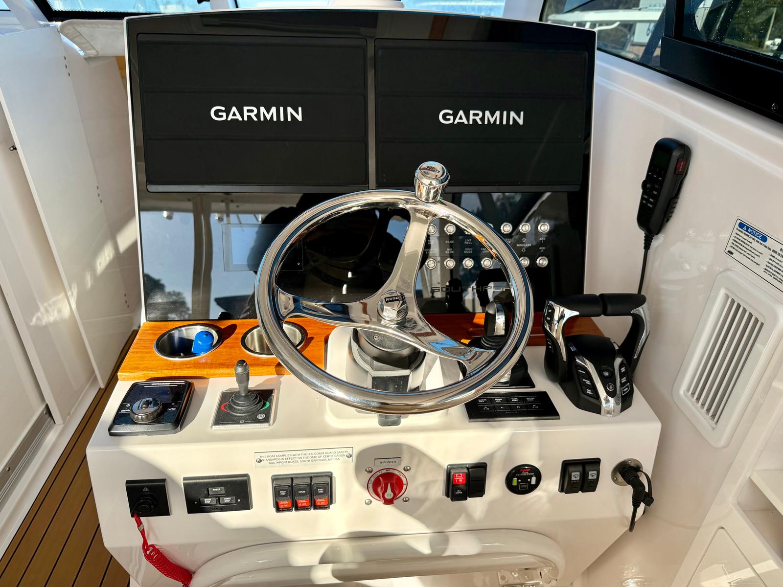 At the helm, you’ll find twin Garmin 16-inch navigation displays with integrated sonar, offering crystal-clear charts, fishfinding capability, and full system integration. A Garmin radar system enhances visibility and safety when running offshore or navigating in limited visibility, and the onboard autopilot allows for stress-free cruising on longer runs. Entertainment is handled by a premium Fusion stereo system with bow-to-stern speakers, delivering rich, balanced sound whether you’re entertaining at anchor or underway.