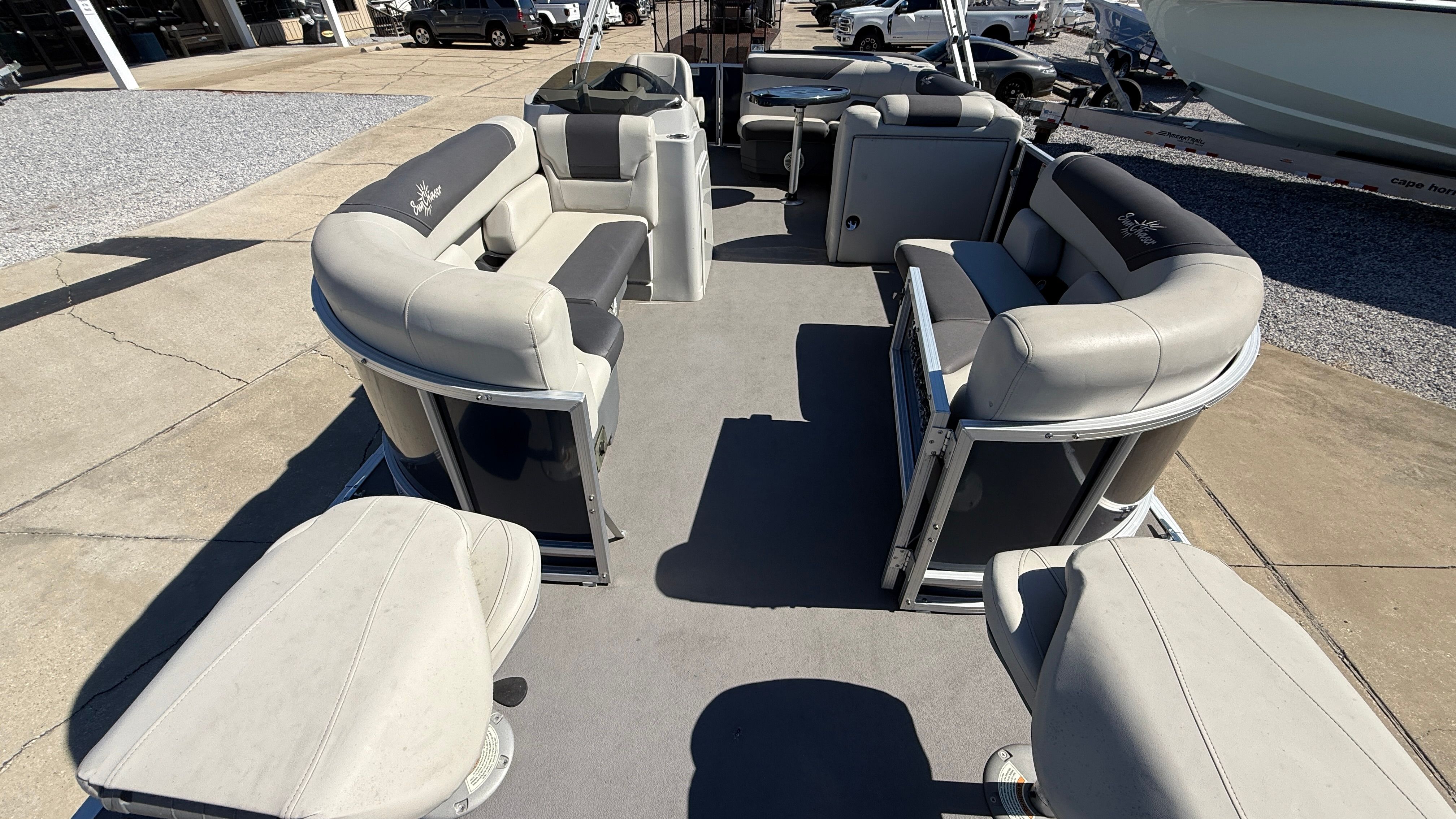 Powering this Sunchaser 22 Fish is a single engine with an impressive 115 horsepower, delivering the perfect balance of speed and efficiency. This engine configuration ensures smooth acceleration and responsive handling, whether you are cruising across the lake or navigating tight marina spaces. The 115 horsepower engine provides plenty of power for towing water toys, reaching your favorite fishing spots quickly, or simply enjoying a leisurely ride with friends and family. The single-engine setup also means easier maintenance and lower operating costs, making this pontoon boat for sale a smart choice for both new and experienced boaters.