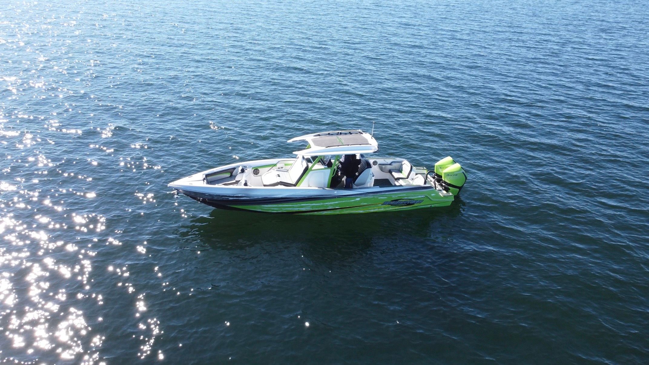 Prepare to turn heads everywhere you go with this stunning 2020 Sunsation 32 CCX. Finished in a custom, high-impact lime green and black graphics package, this boat is the perfect fusion of exhilarating performance and center console versatility. With only 133 hours on its twin Mercury Racing 450R engines, this vessel is barely broken in and presents in immaculate condition.