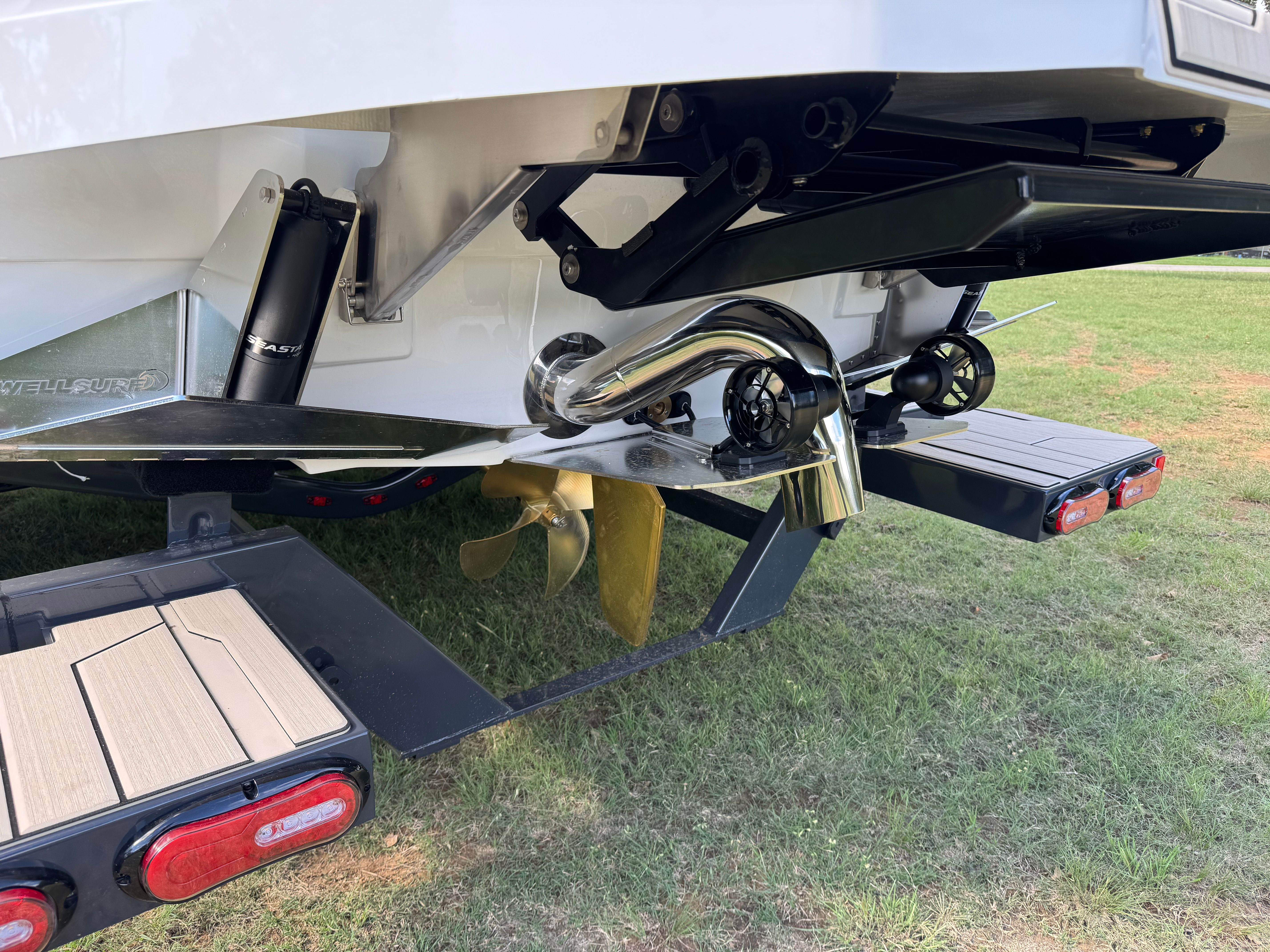At the heart of the Supra SE 550 is the formidable Ford Raptor 575 6.2L engine by Indmar, delivering an impressive 575 horsepower. This powerhouse ensures rapid acceleration, smooth cruising, and the ability to generate massive wakes and waves for all your skiing and wakeboarding adventures. The CNC 16.00x13.90, 4-blade prop is meticulously crafted for optimal thrust and efficiency, while dual stern thrusters provide enhanced maneuverability, making docking and tight turns effortless. Electric power assist steering further elevates the driving experience, offering precise control and responsiveness whether you’re carving through the water or navigating busy marinas.